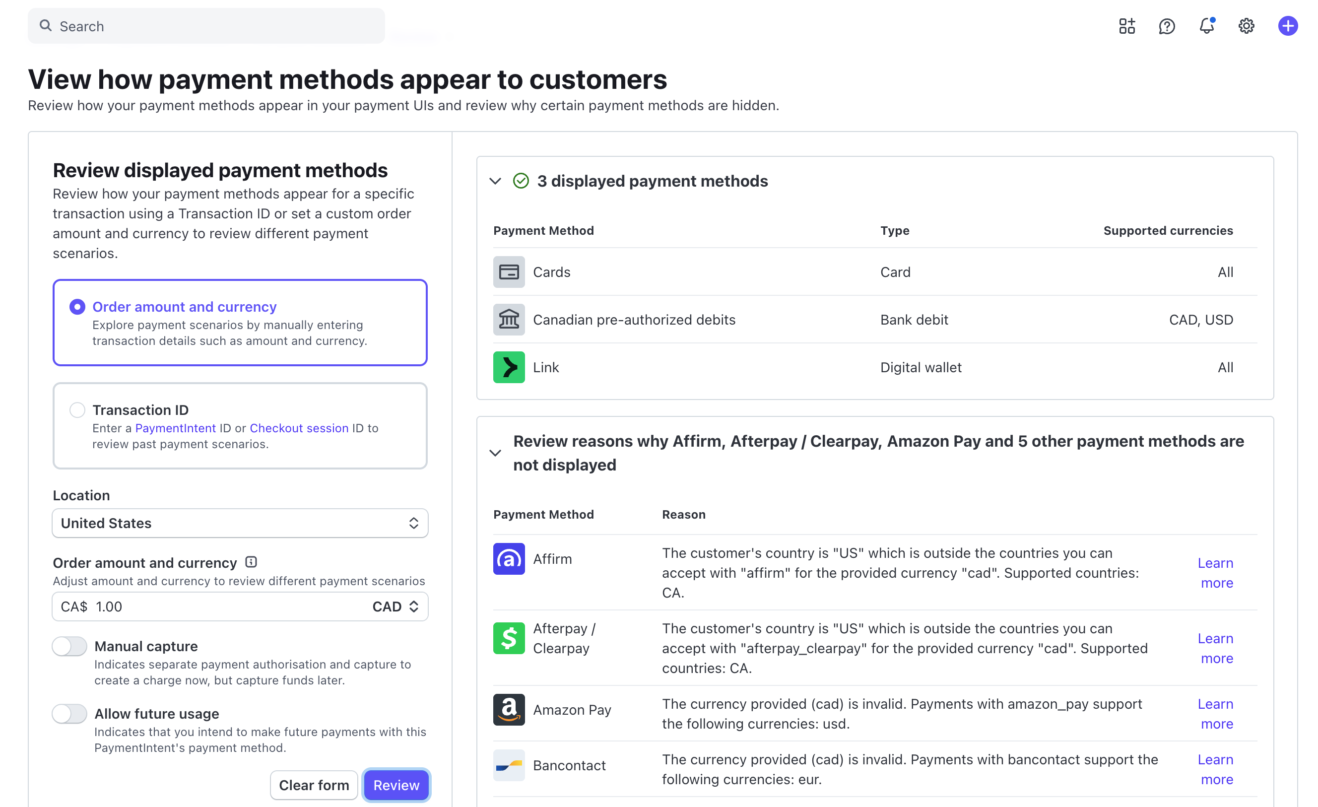 If any of these requirements are not met for that transaction, Stripe will hide the method.