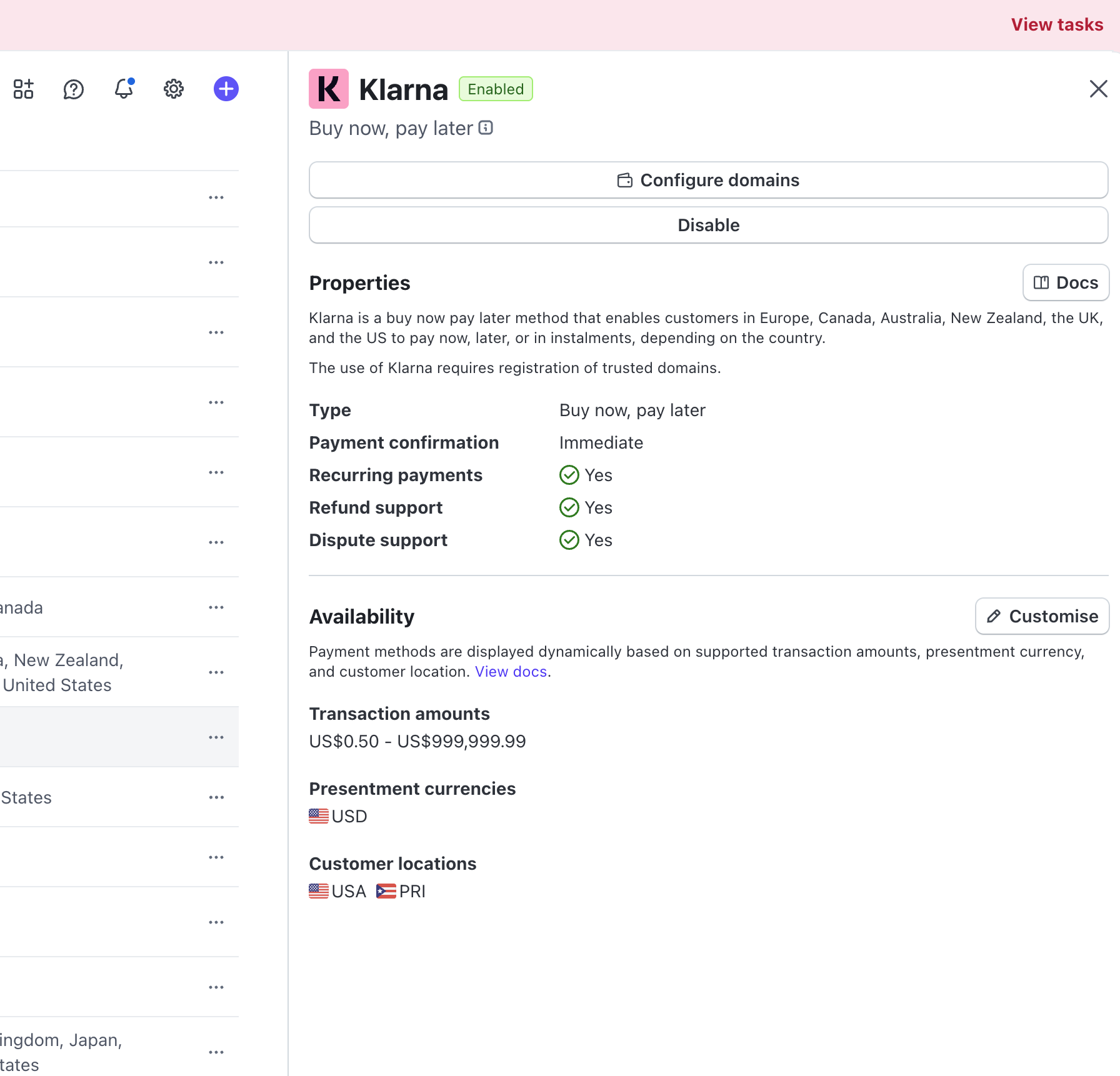 ,So in this case, for your account, Klarna will only work is your payer is in USA and Puerto Rico with the currency on checkout being USD.