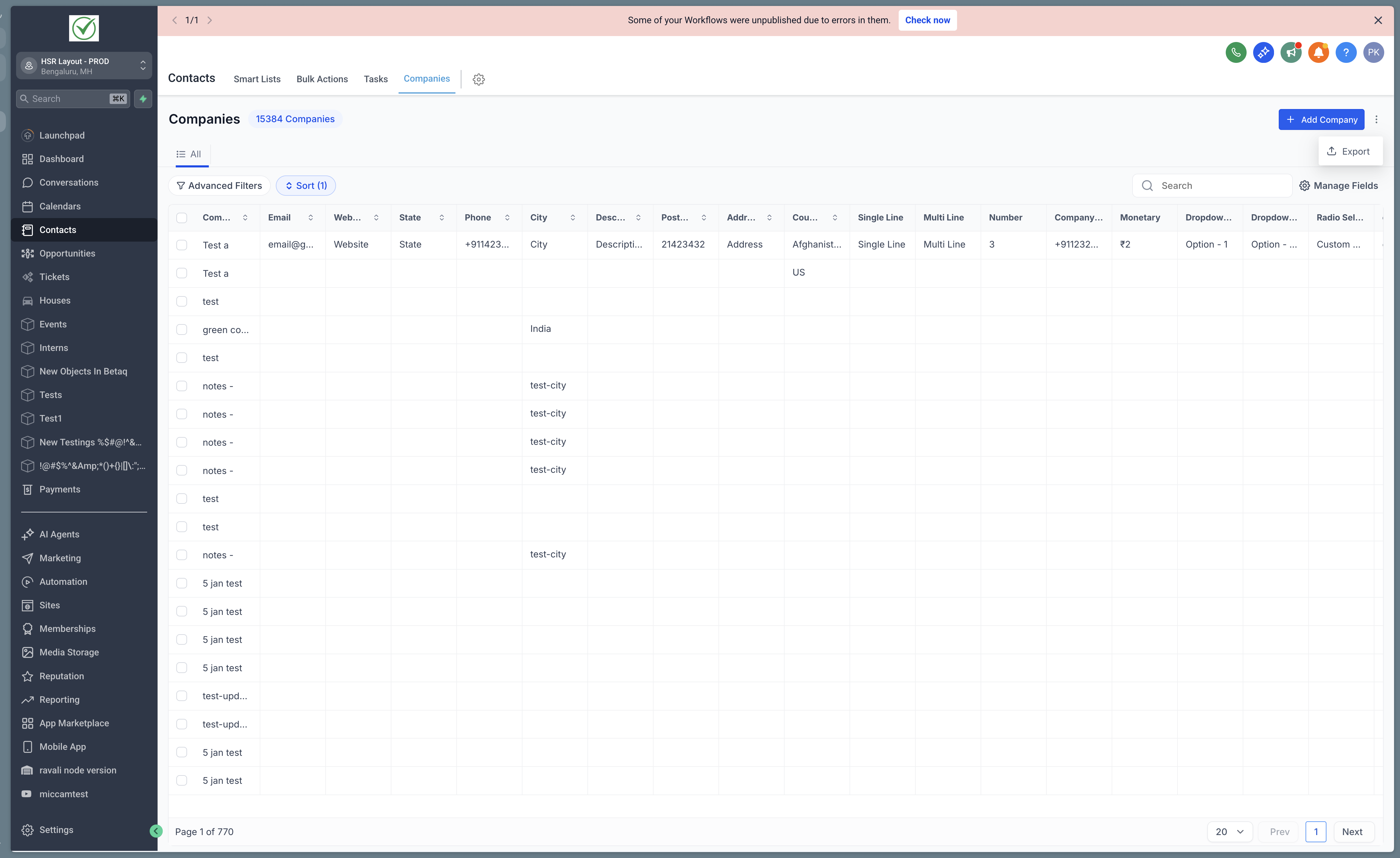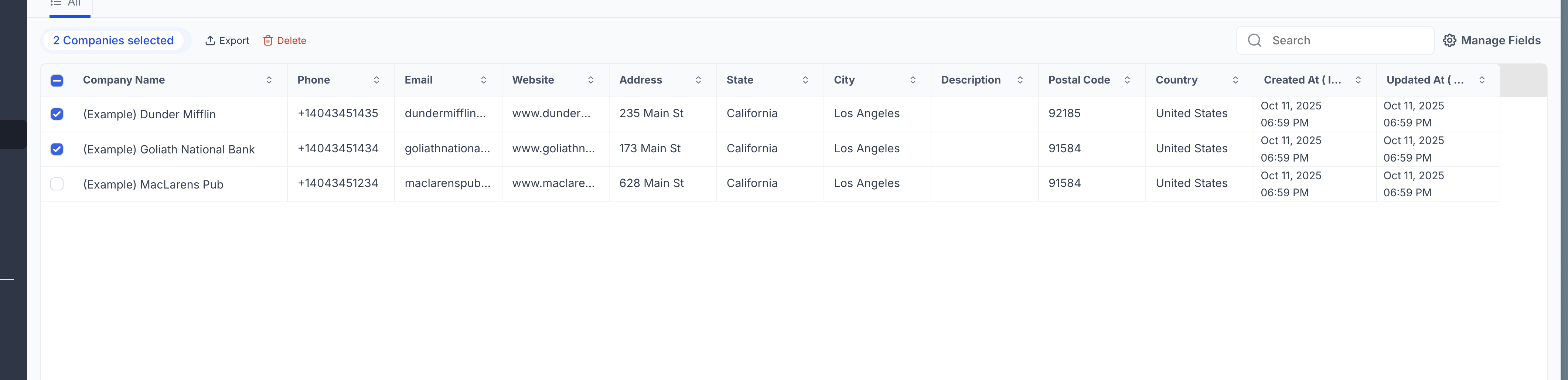 Export multiple Company records at once from the Contacts → Companies section. Whether you need a few selected records or the entire company list, exports can be completed in just a few clicks.