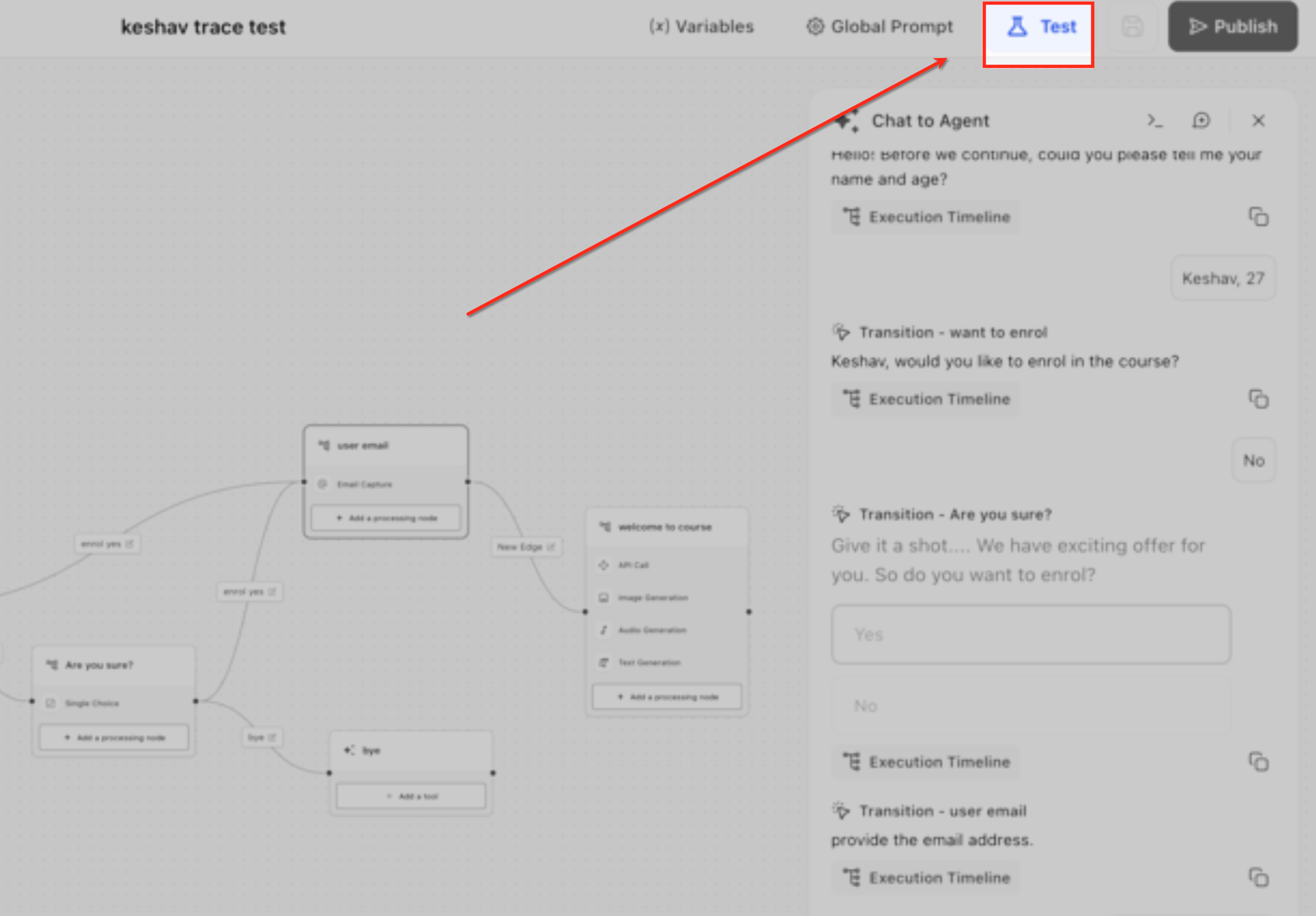 Send a test message in the emulator or trigger the agent via API. As the agent processes the request, each node transition, tool call, and model execution step logs in real time in the Timeline panel.