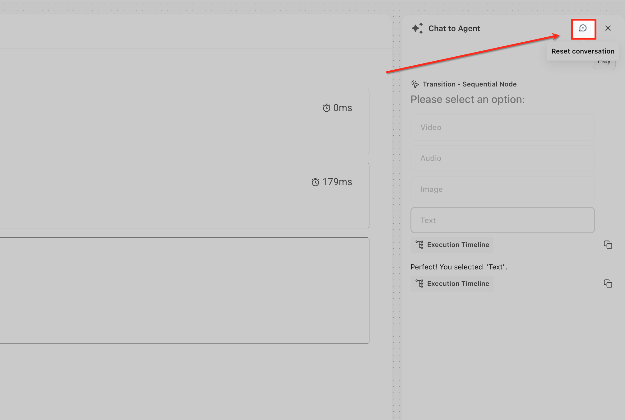 In the Execution Timeline, each step displays a purple label. These clickable Transition labels indicate the exact node the conversation moved to during execution. Clicking the label automatically focuses and highlights that node on the canvas, allowing you to review or modify its logic immediately without manually searching through your flow.