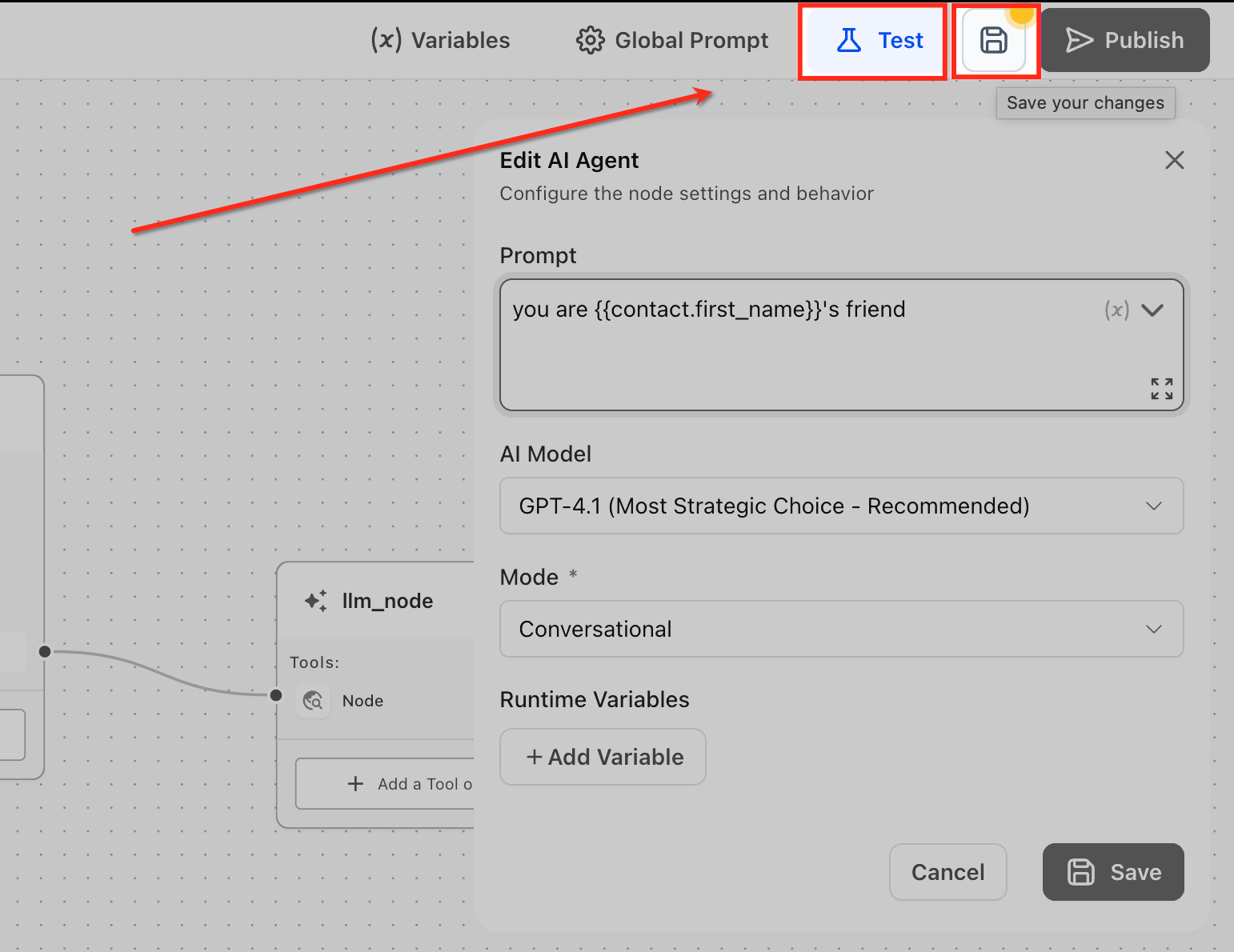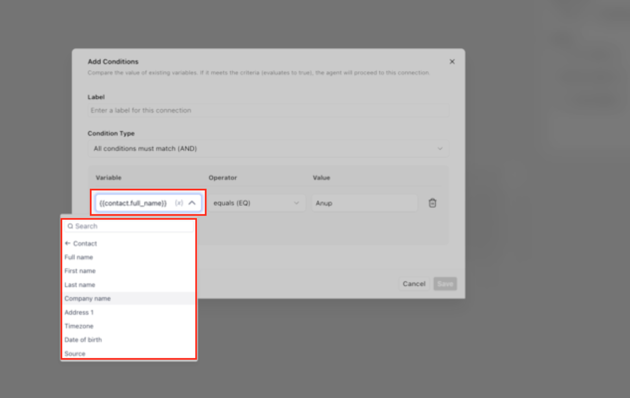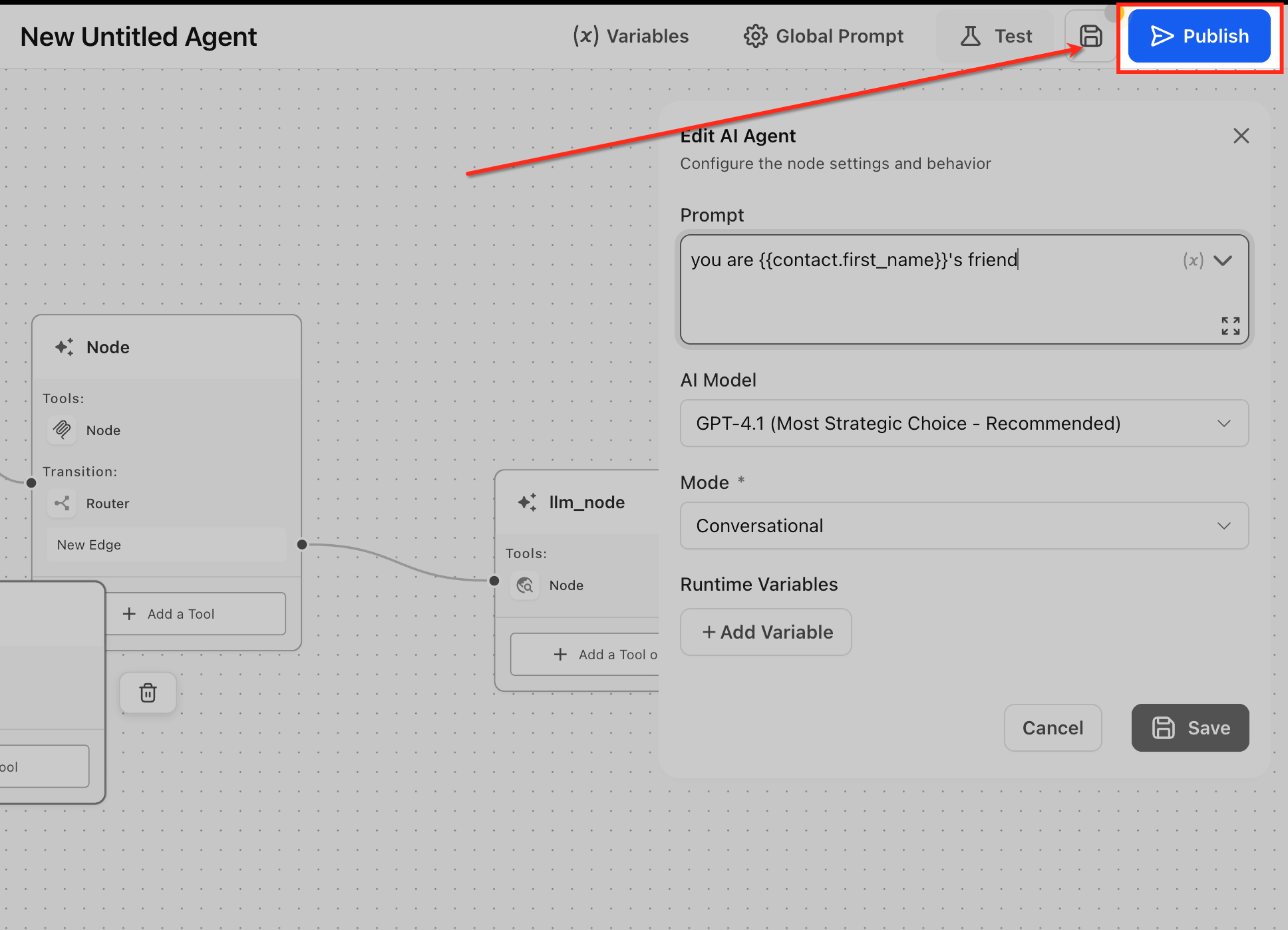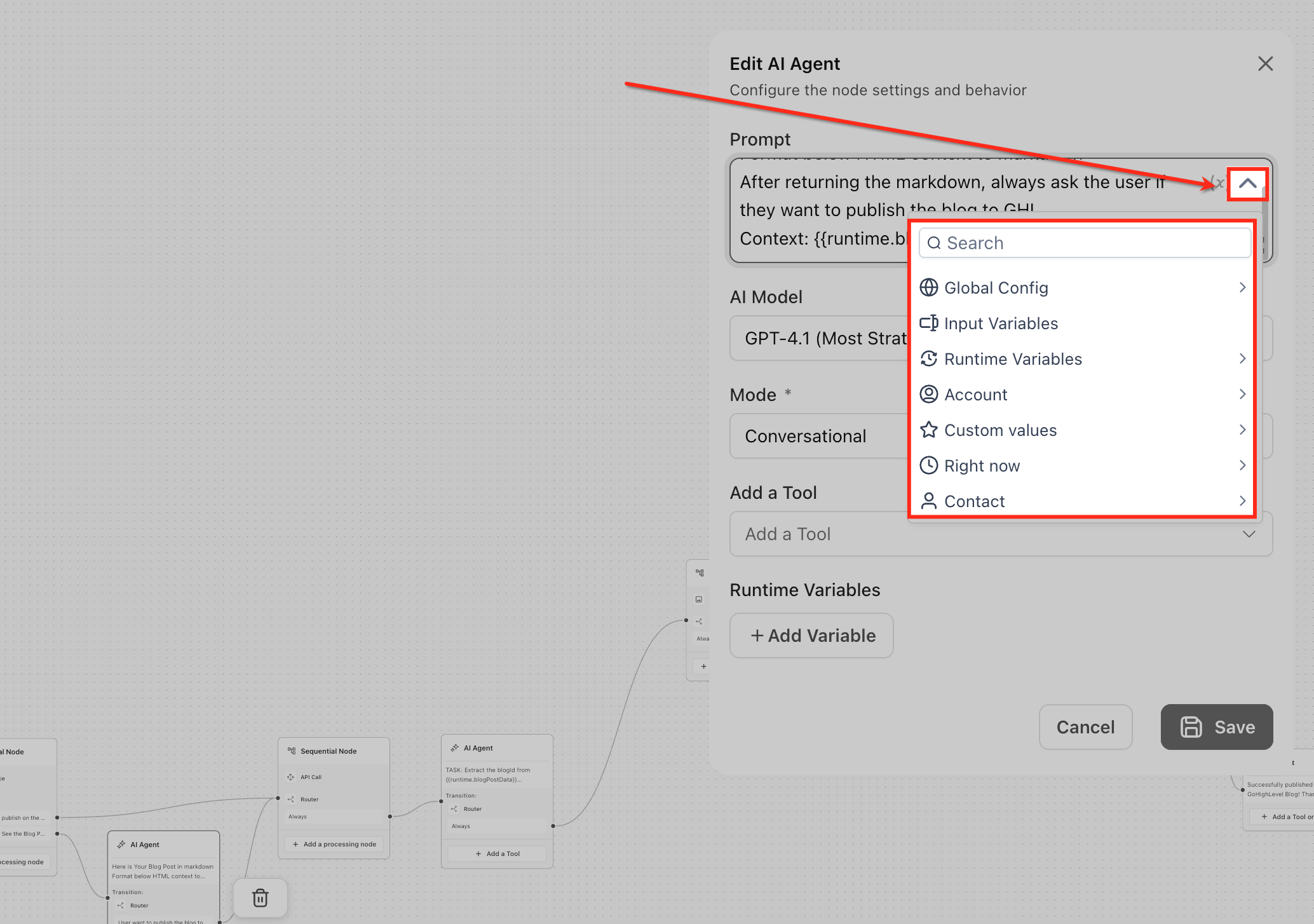 You can use variables anywhere you type text inside Agent Studio, including AI Agent prompts, Text Generation nodes, tool inputs, message cards, and conditional logic fields. Simply click the dropdown arrow in the text field to insert a variable or type it manually using {{ }}.