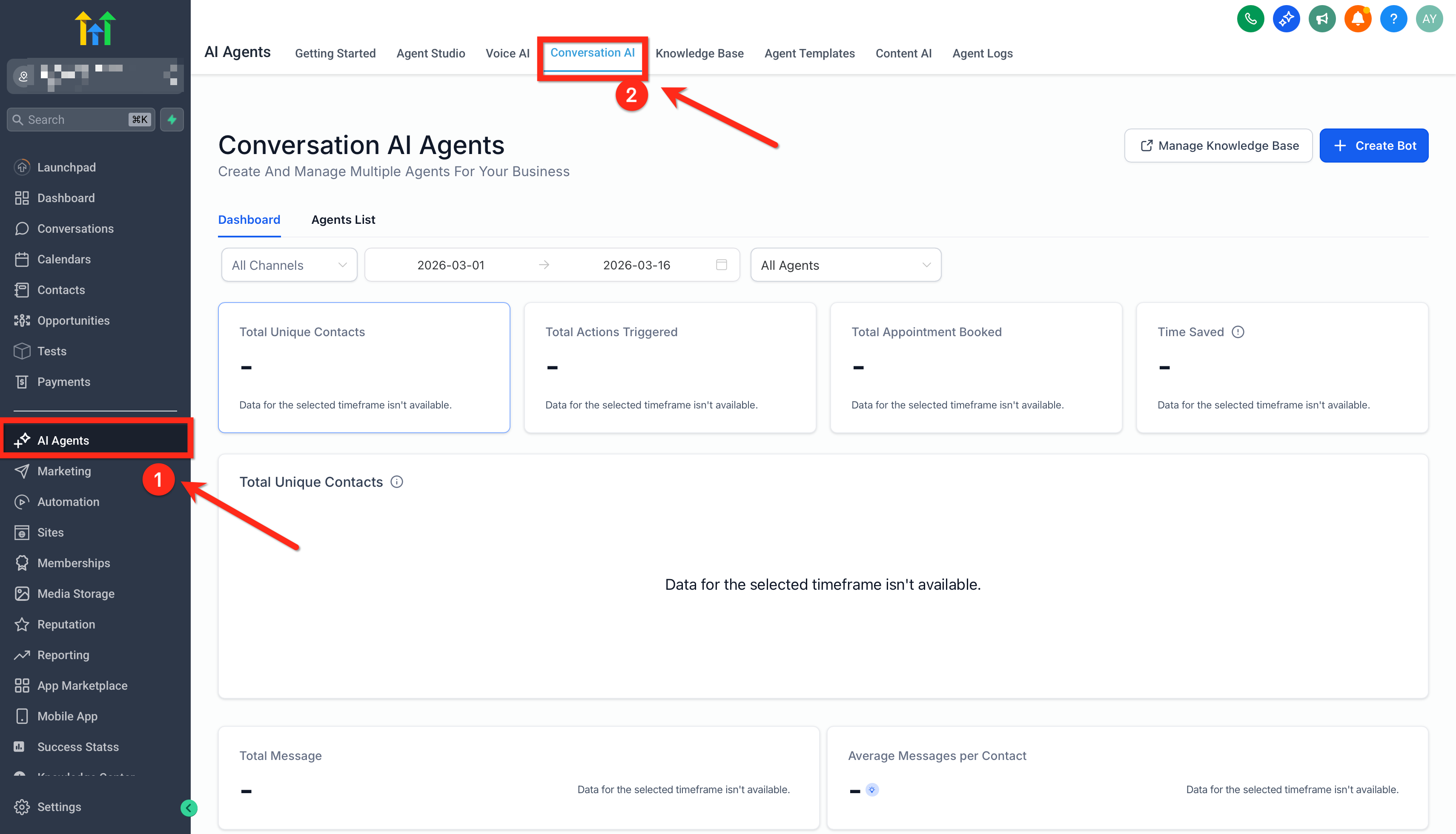 Navigate to AI Agents → Conversation AI and verify the dashboard loads.