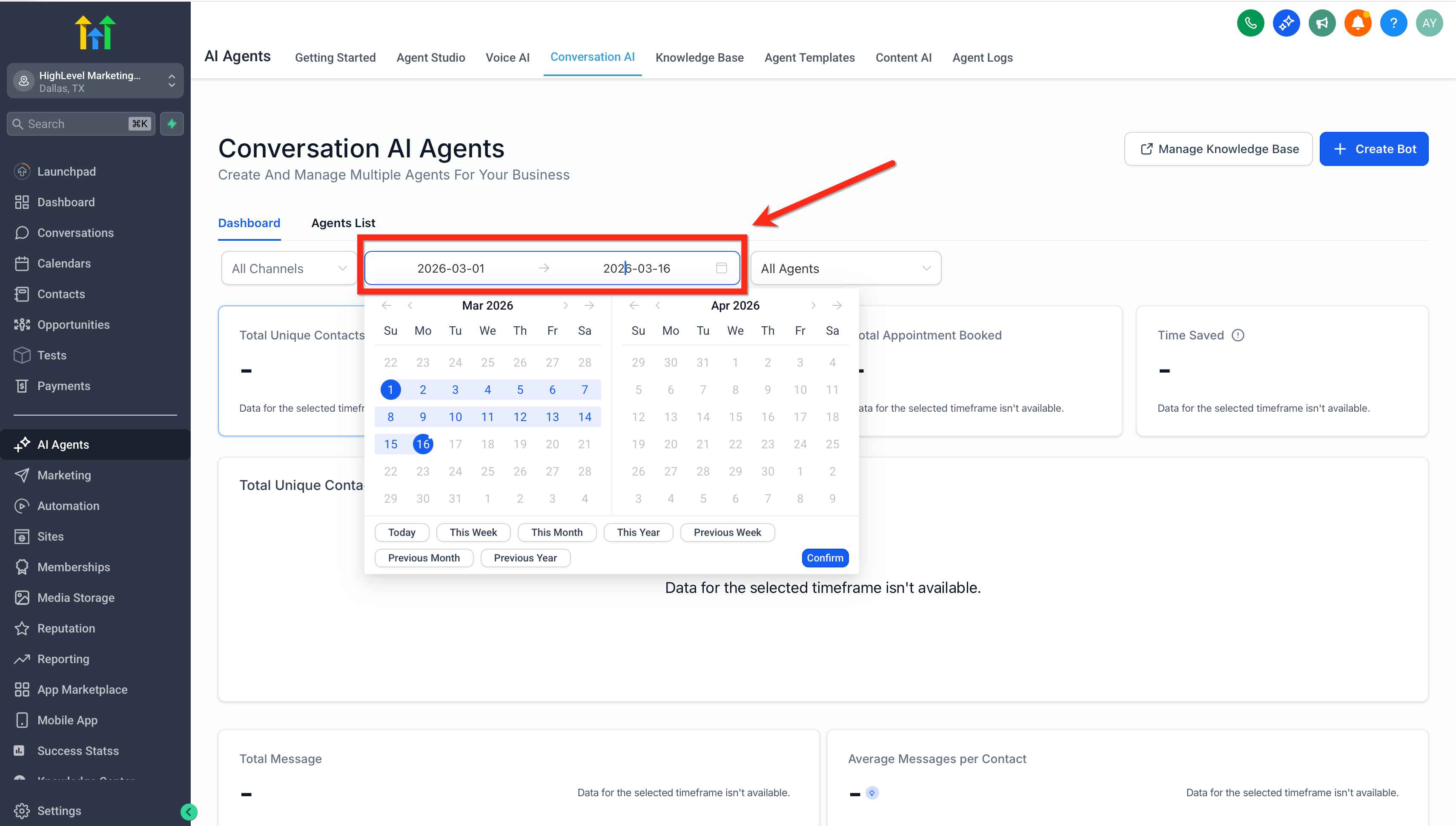 Get a single, consolidated view of performance across all Conversation AI agents in HighLevel. The Conversation AI Dashboard helps teams monitor trends, compare agent performance, and spot opportunities faster using filters like Date Range, Channel, and Agent. Access is permission-based, so you can confidently share insights with the right team members.