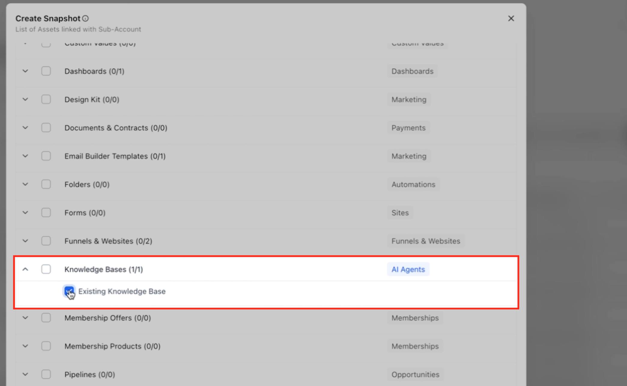 If your agent uses a Knowledge Base, you must select that Knowledge Base when creating the snapshot. Snapshots package only the assets you choose. If a connected knowledge base is not selected, the agent may load without its reference material. Always review the asset selection screen before proceeding.
