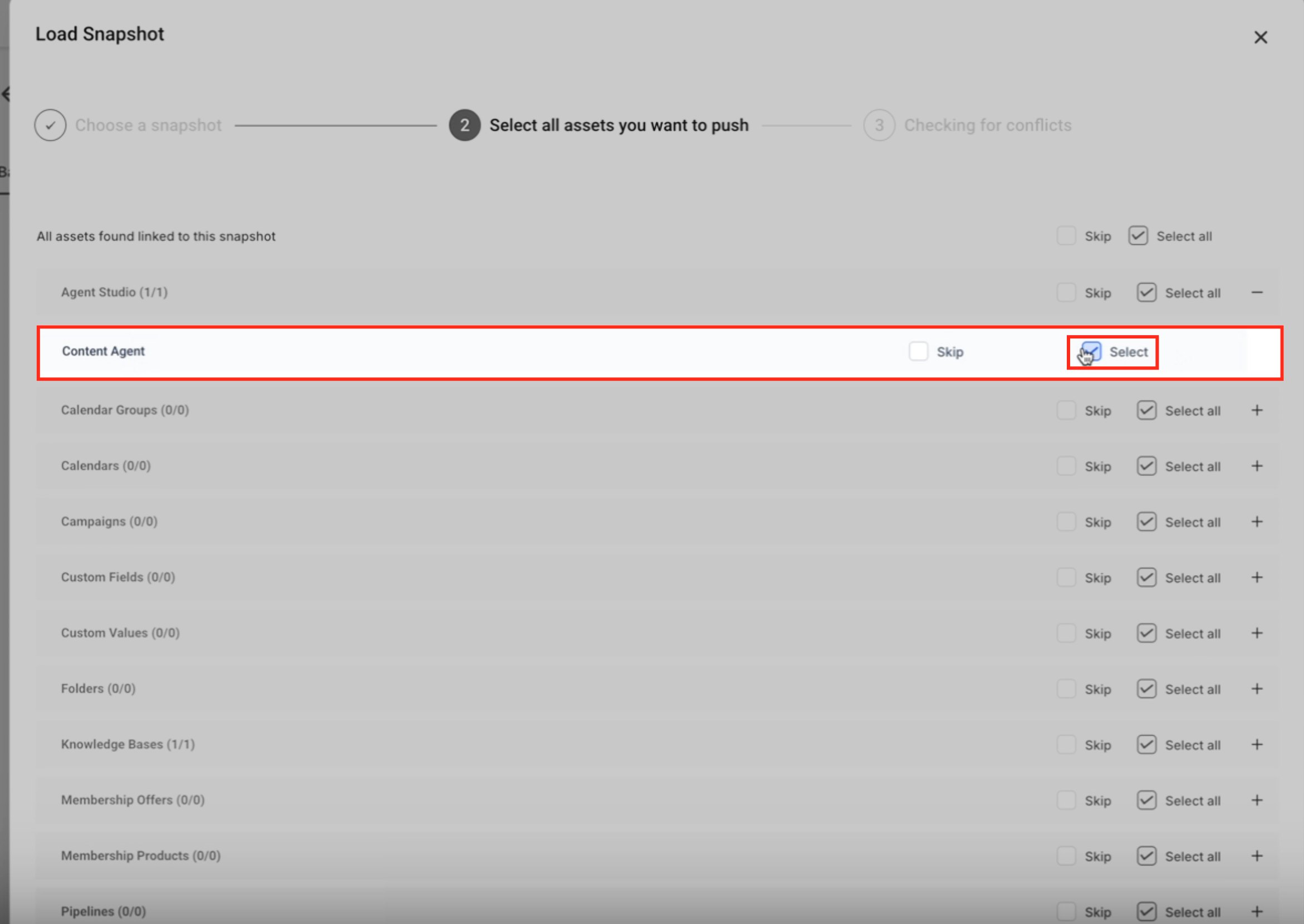 If an asset with the same name already exists in the target account, HighLevel will prompt you to resolve conflicts.