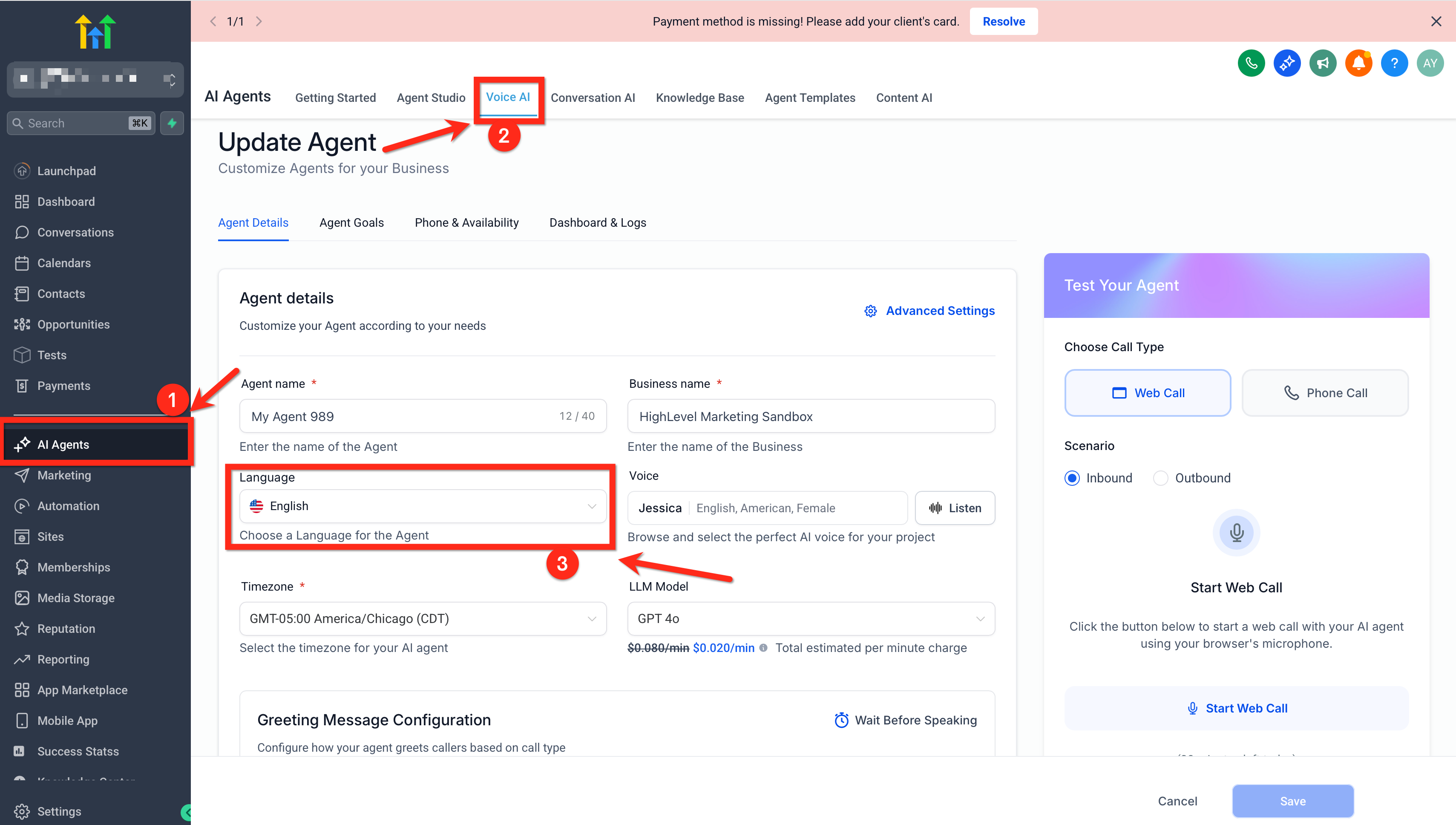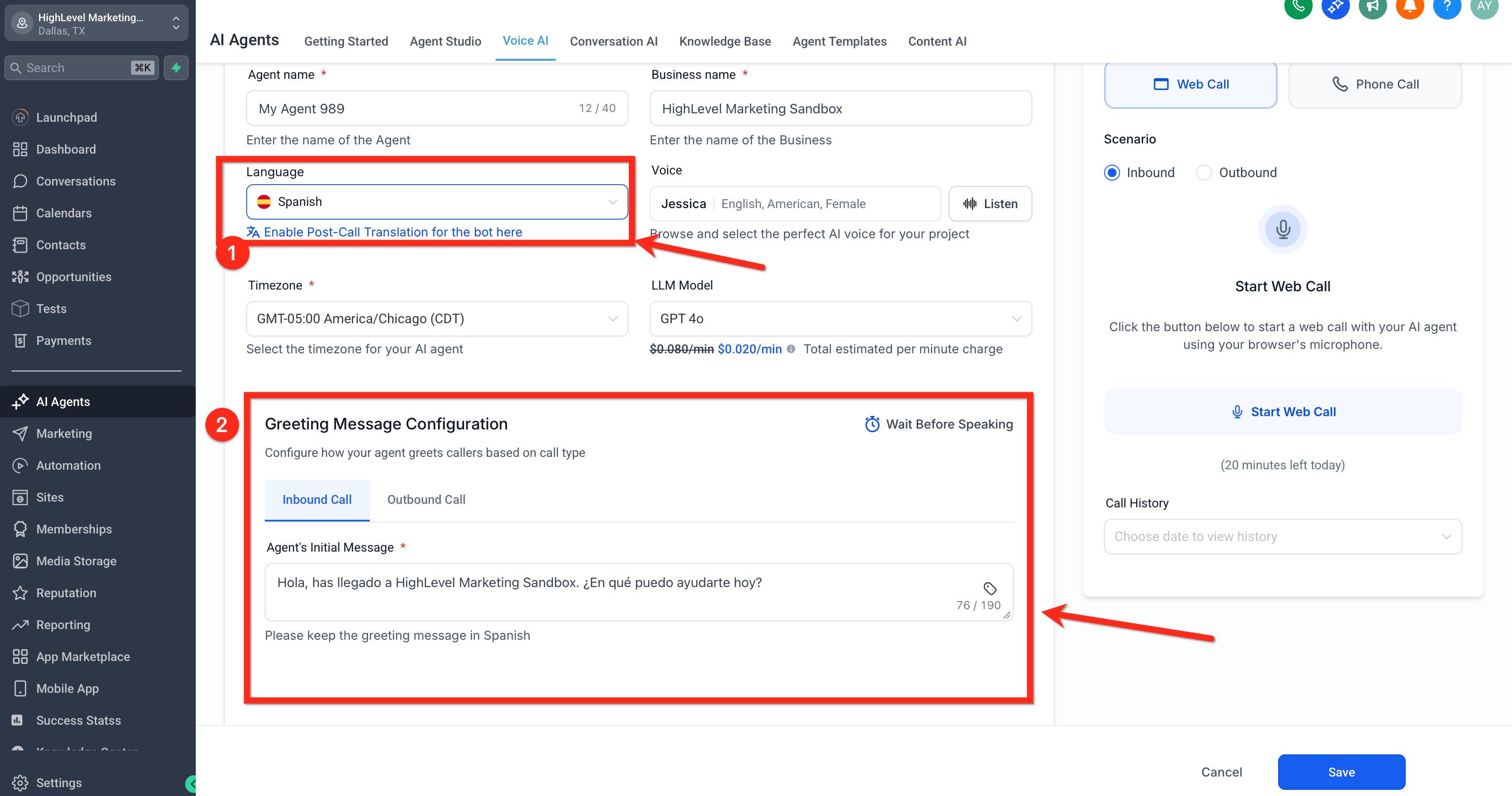 The Initial Greeting Message is part of the Voice AI Agent setup experience in HighLevel. Knowing where this field lives makes it easier to confirm that the translated greeting matches your intended caller experience and brand voice before the agent goes live.