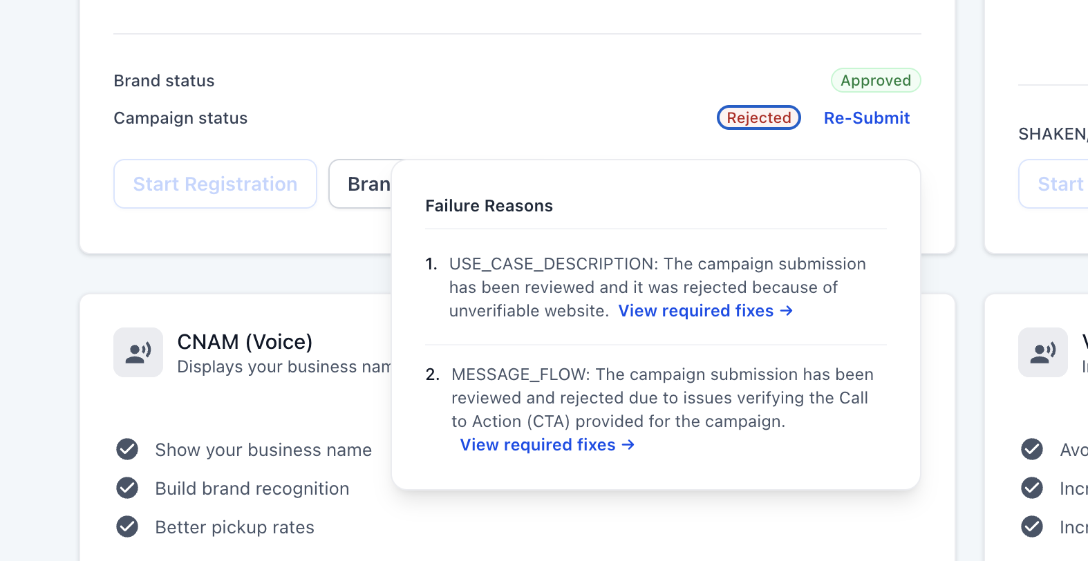 When an A2P 10DLC campaign is rejected, it's important to understand exactly what went wrong , and what needs to change before you resubmit. We've made this process clearer with a new "View required fixes →" experience that gives you structured, actionable detail for every rejection reason.