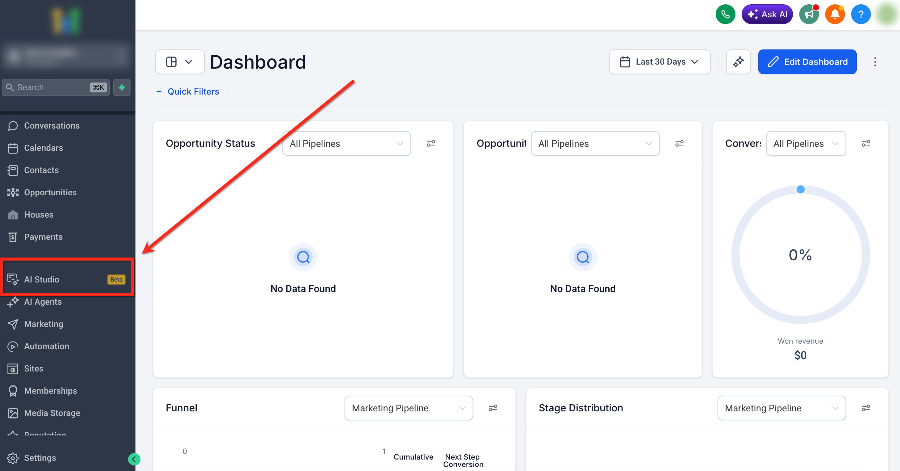AI Studio is available from the left navigation inside your sub-account after it has been enabled in Labs. This makes it easy to return to your projects and continue working from the same workspace over time.