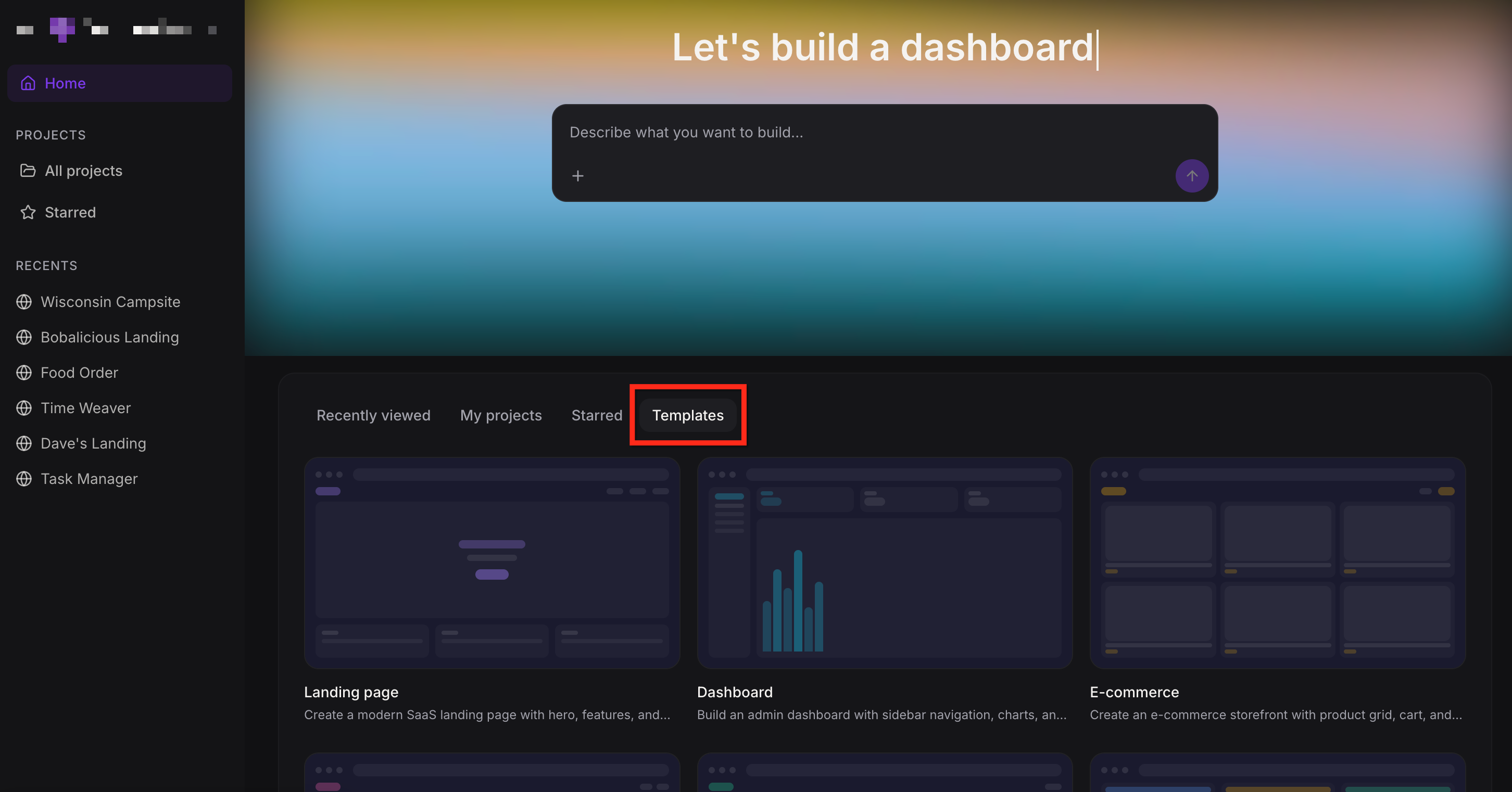 Template options such as landing pages, dashboards, ecommerce storefronts, portfolios, and blogs