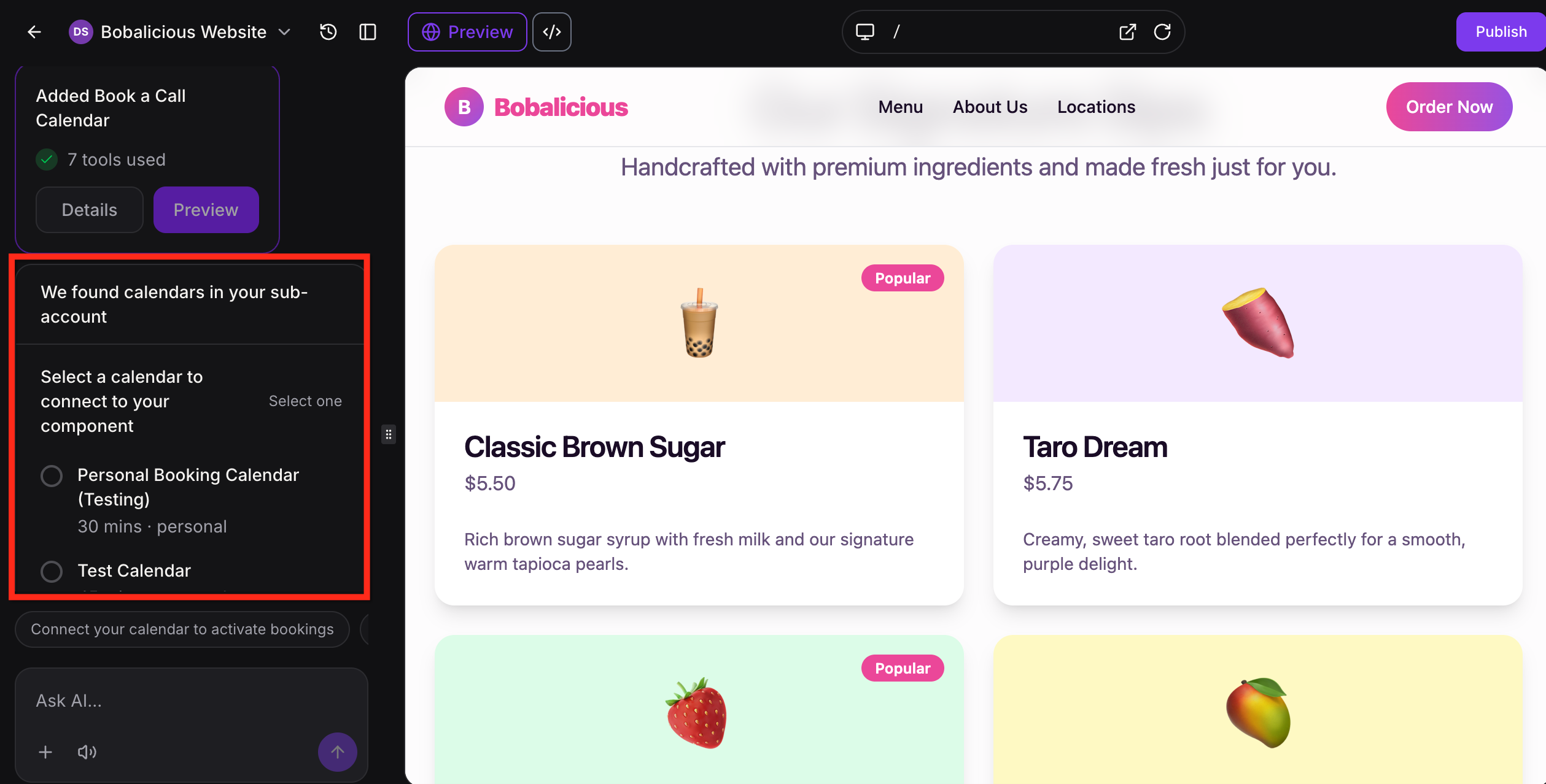 To make that booking experience functional, AI Studio can detect calendars that already exist in the sub-account and prompt you to choose which one to connect. At a high level, the calendar flow works like this: