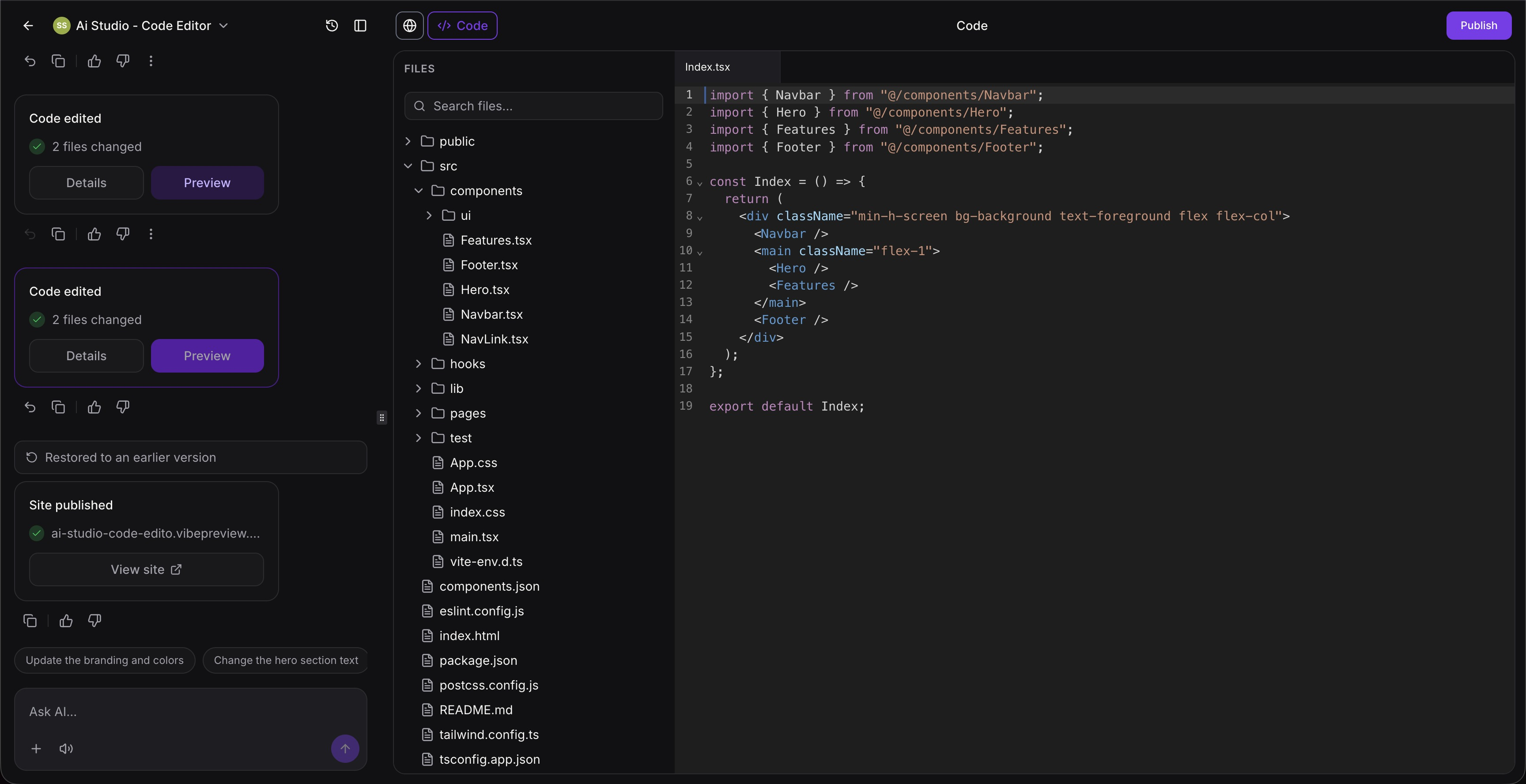 AI Studio also includes a built-in Code Editor for users who want more direct control over their projects. The Code Editor allows you to manually edit the underlying code for more precise customization.