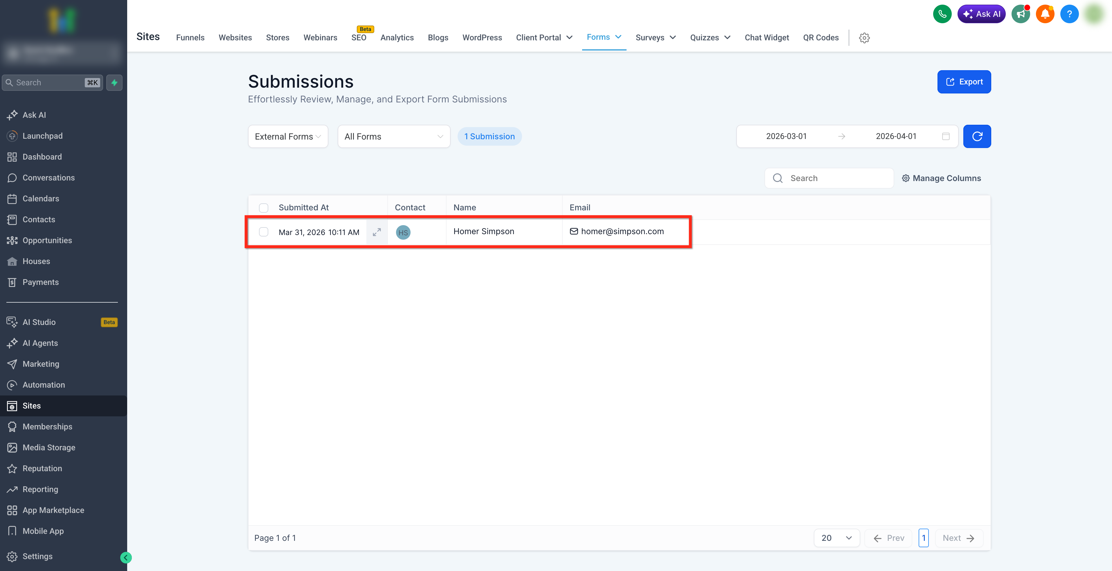 Once connected, form submissions go into the connected sub-account CRM setup, not into the AI Studio project itself. This means that the page lives in AI Studio but the responses, contacts and submission activity go into the connected HighLevel account. After connection, form submissions can appear under form submissions as third-party submissions, and they can also be tied into workflow activity through external tracking behavior.