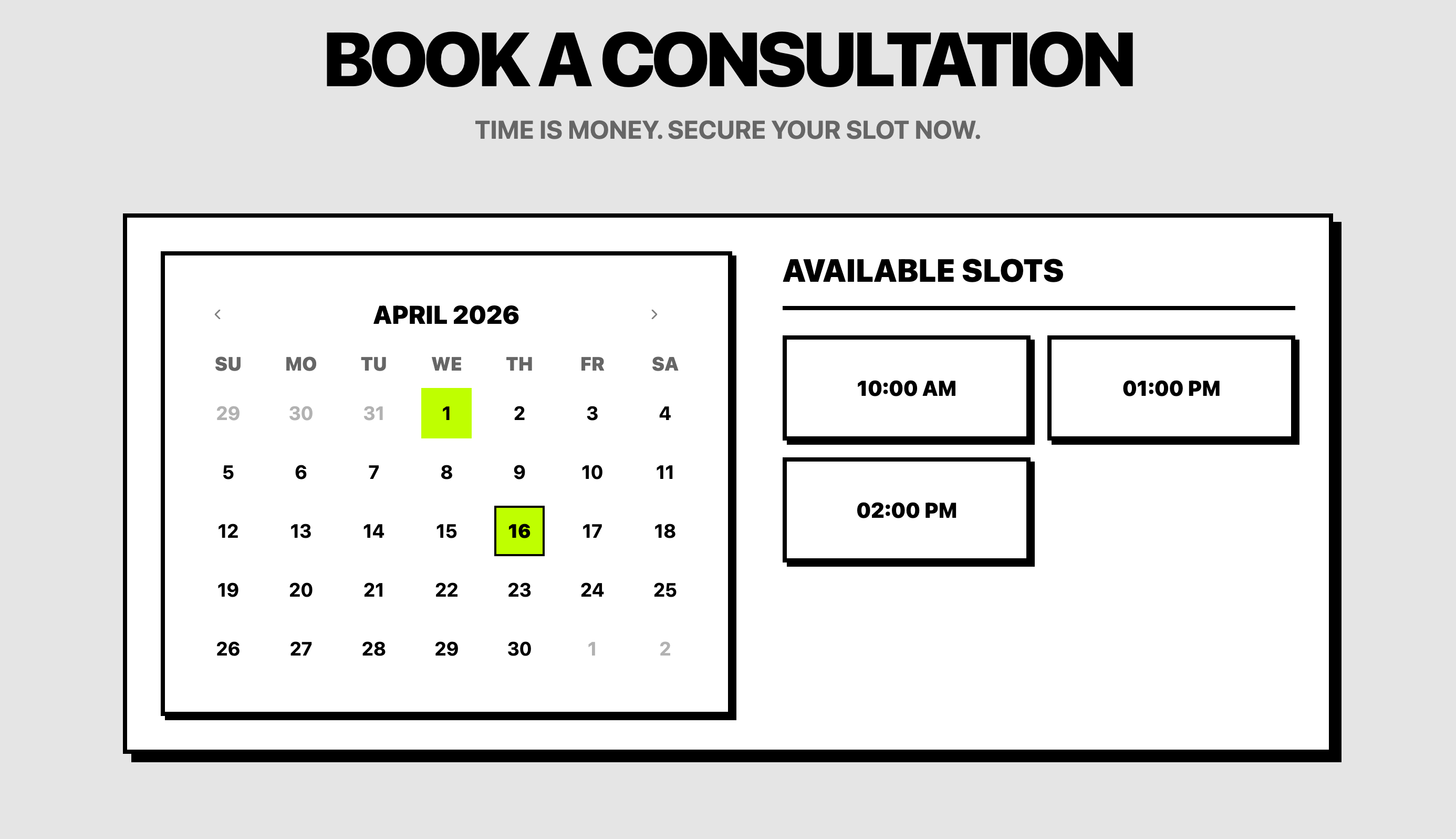 AI Studio can create a custom booking experience on the front end instead of only embedding a standard calendar widget layout. If you ask AI Studio for an appointment page, consultation page, or discovery call page, it can generate the front-end layout and add a booking area as part of the experience.