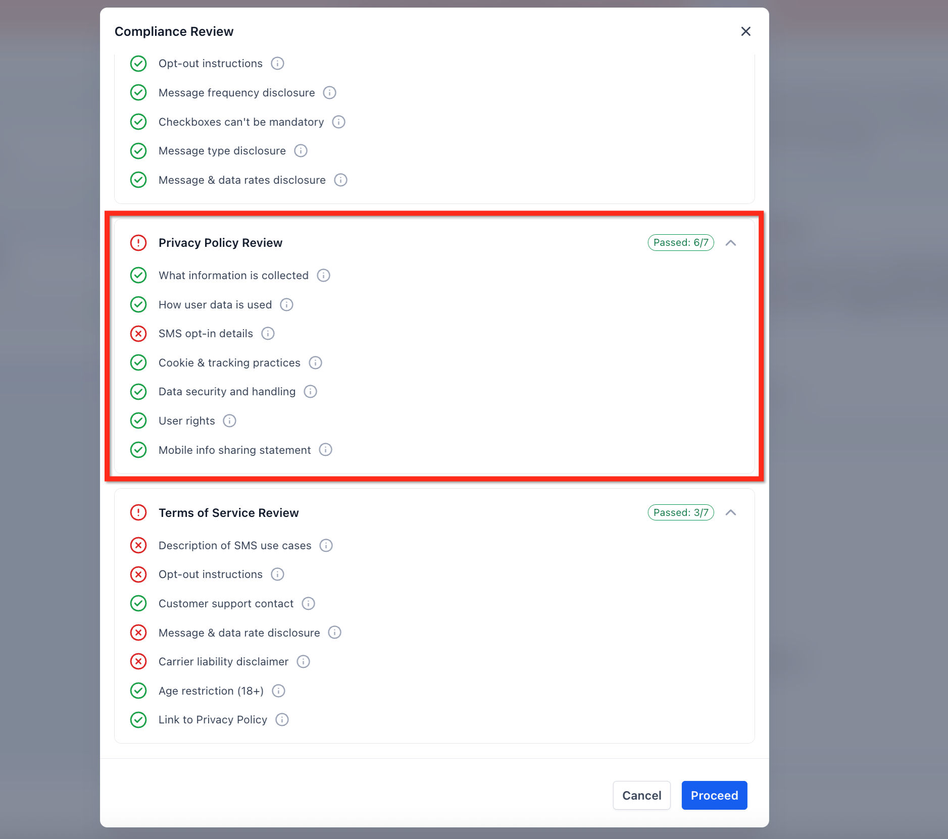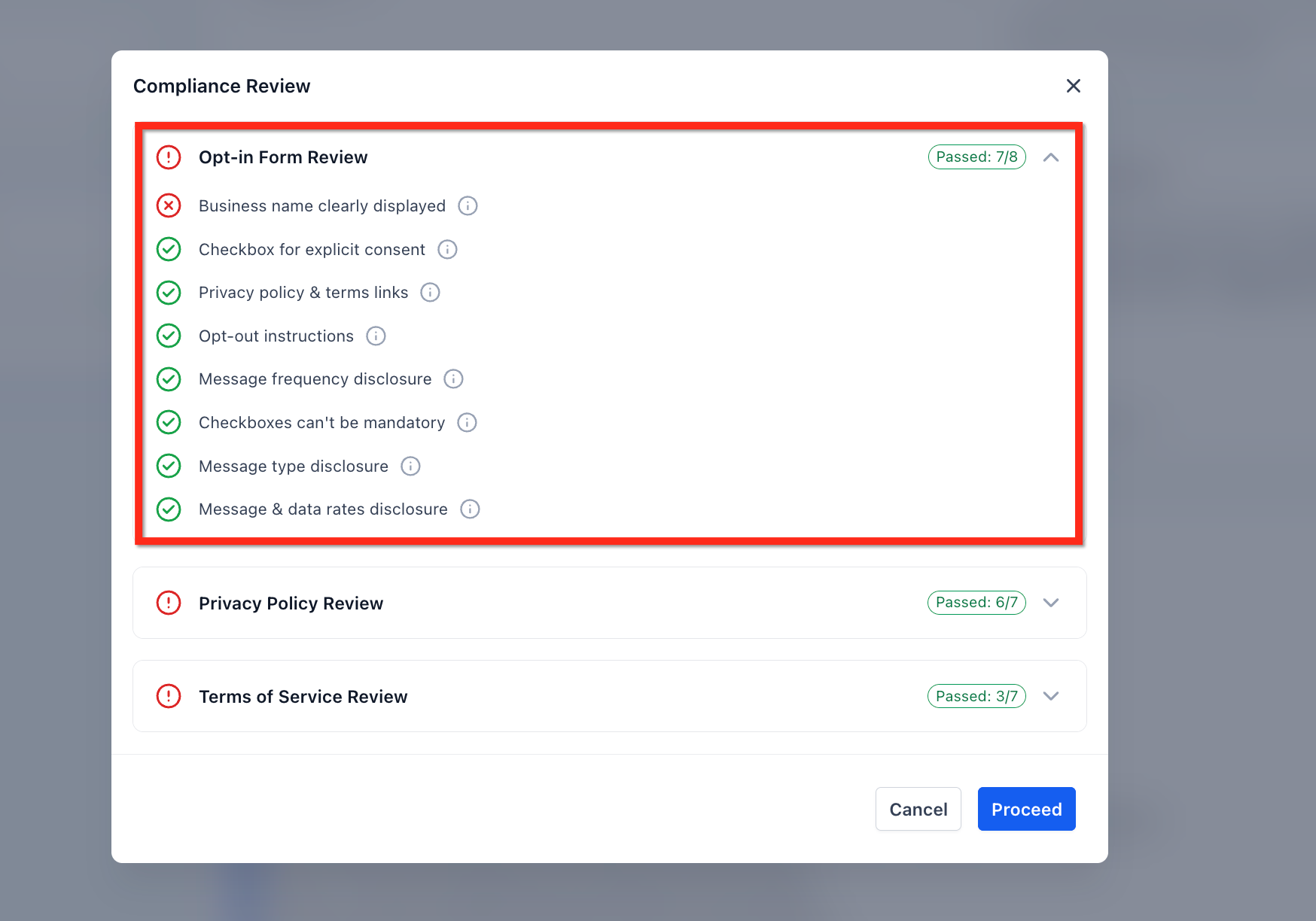 Before you submit the application, the system automatically scans the opt-in form URL and reviews the linked Privacy Policy and Terms of Service pages. The Compliance Review modal opens automatically.