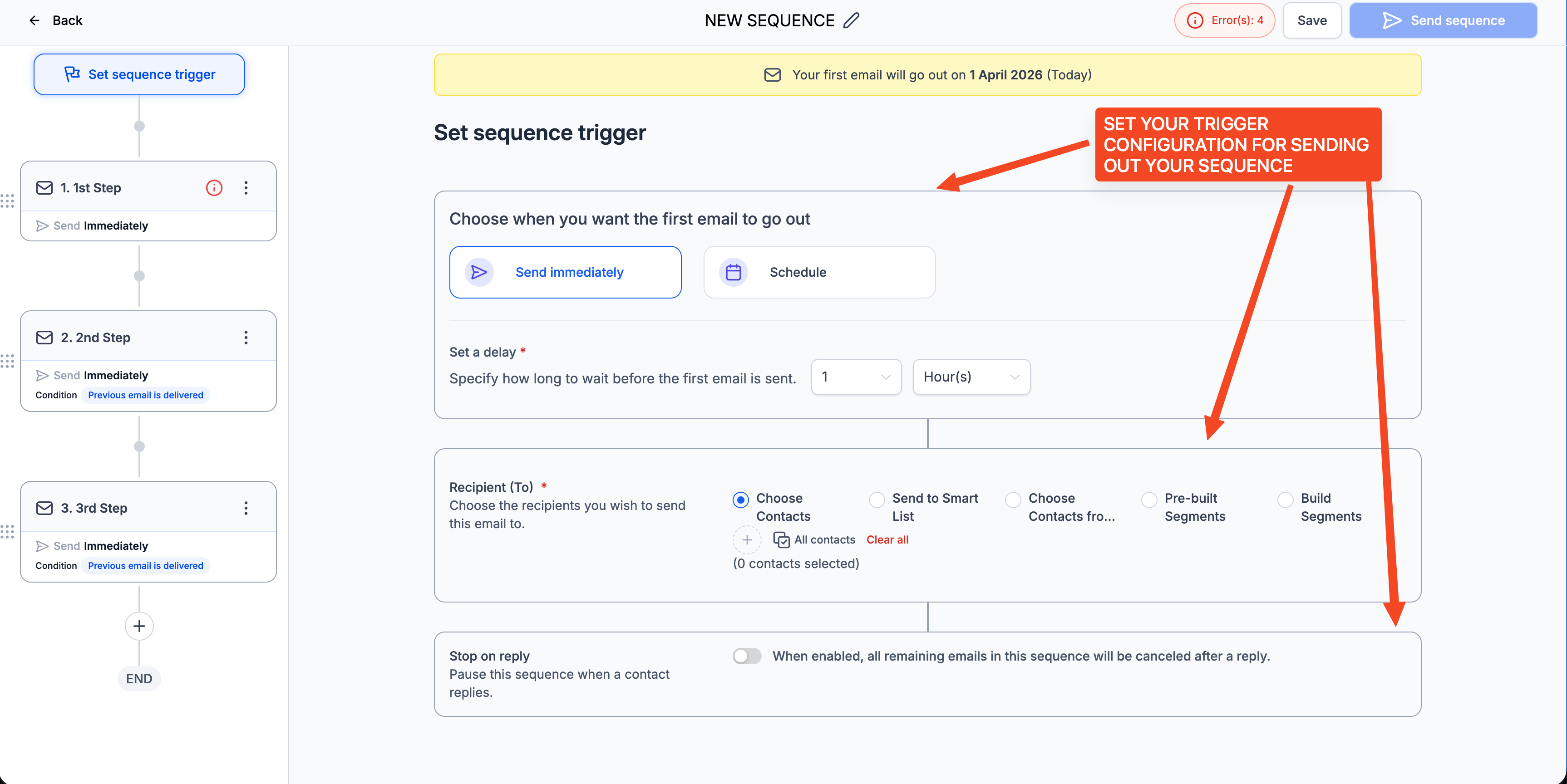 - Choose when the sequence should start: