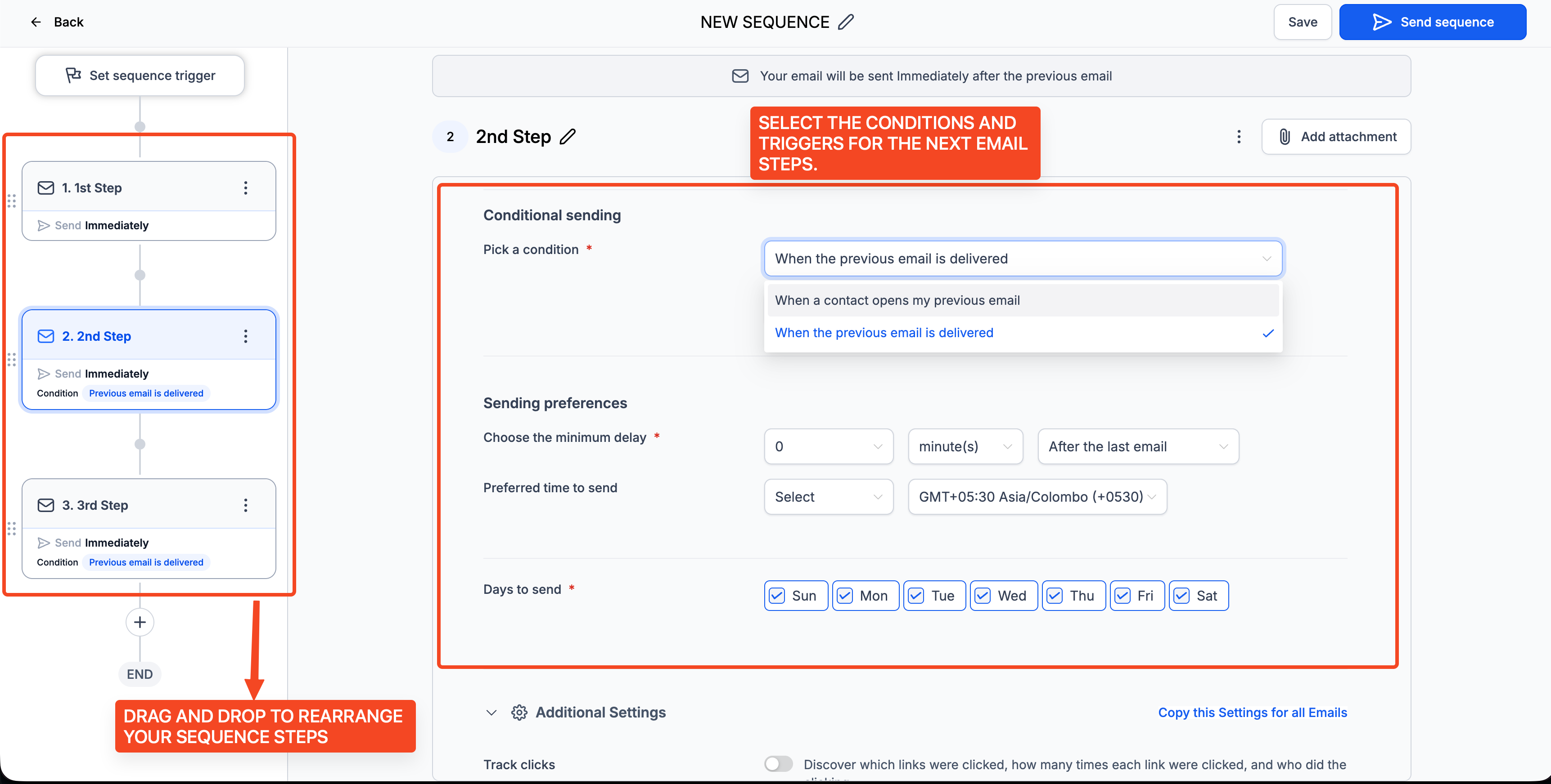 - Set conditions (e.g., send only if previous email was opened/delivered)