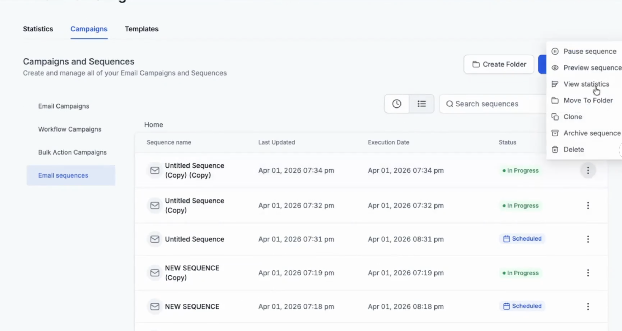 8. In the list view, click on three dots to access all the statistics - individual email step level and overall email action level.
