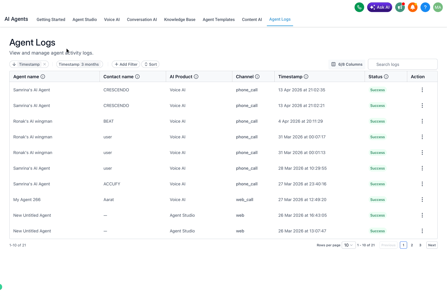 Agent Logs helps you understand how an AI agent handled an interaction by combining conversation context with execution details in a centralized view.