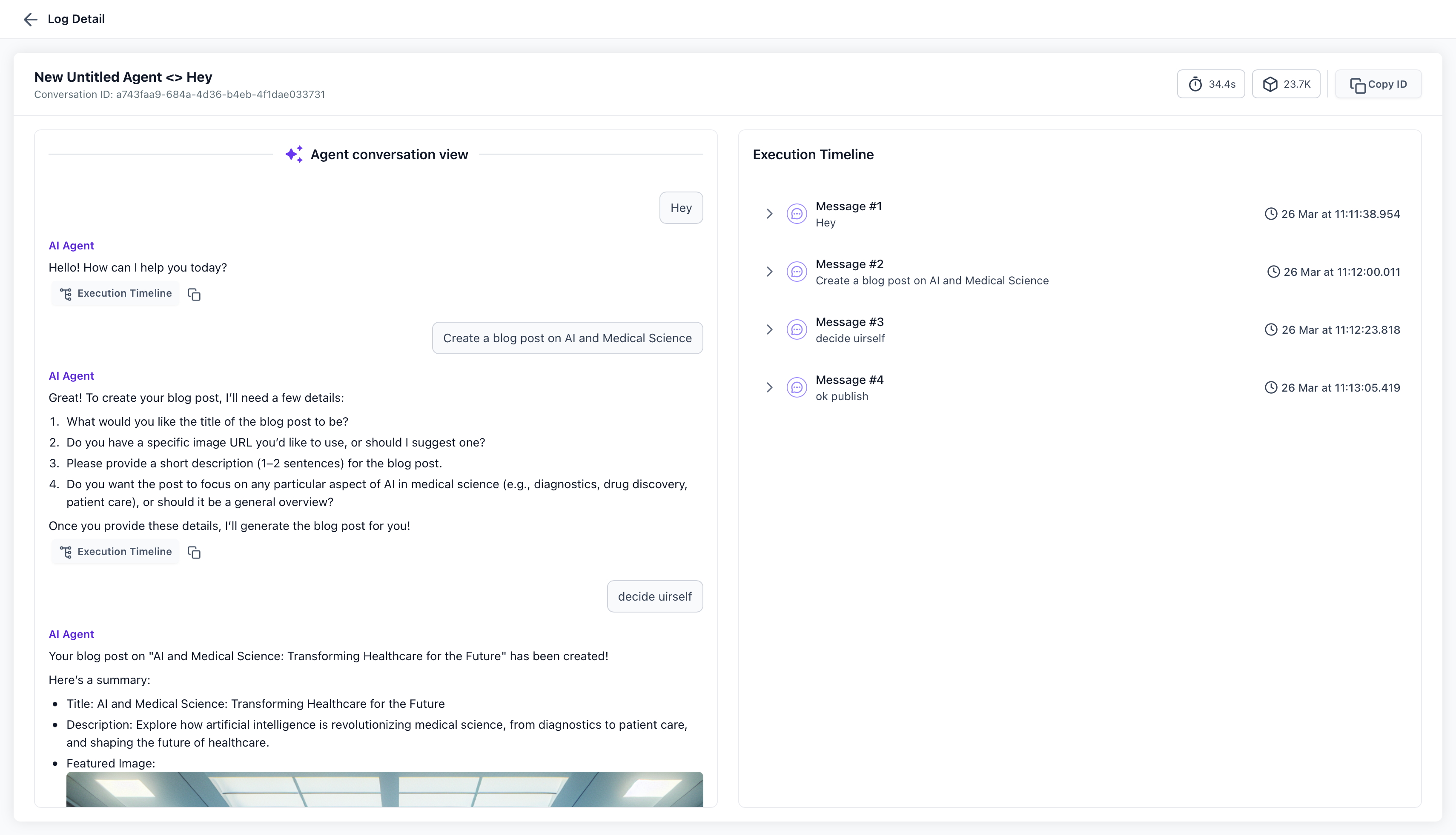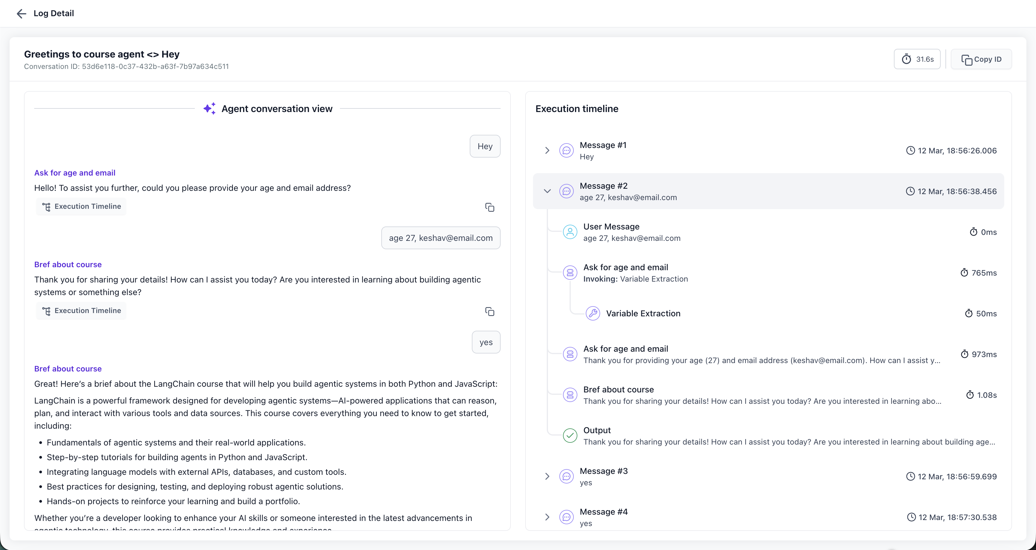 The Conversational Context & Timeline is the Level 2 experience in Agent Logs. After selecting a specific interaction, you can review the conversation alongside an execution timeline.
