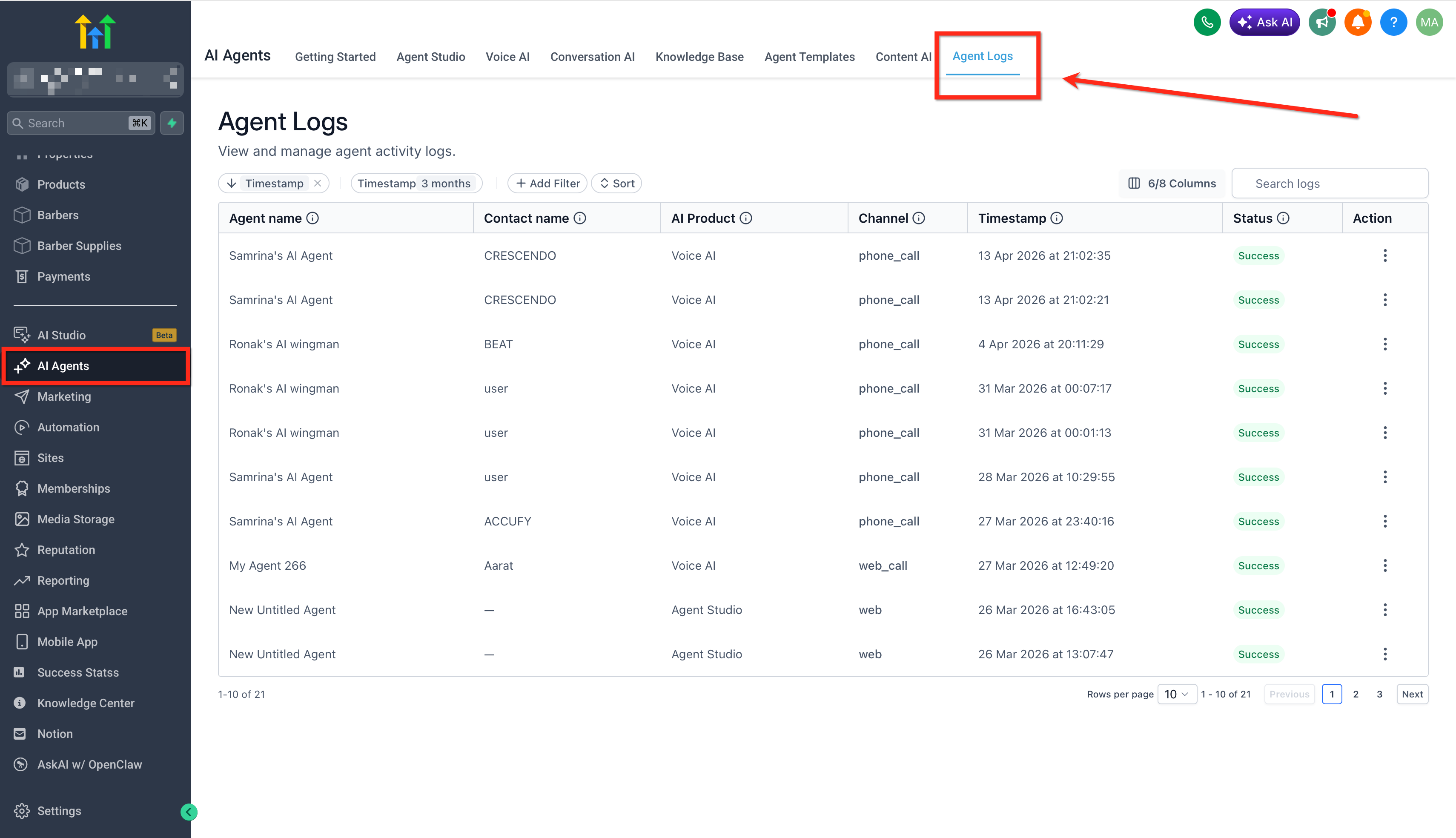 - Open AI Agents > Agent Logs in your HighLevel account.