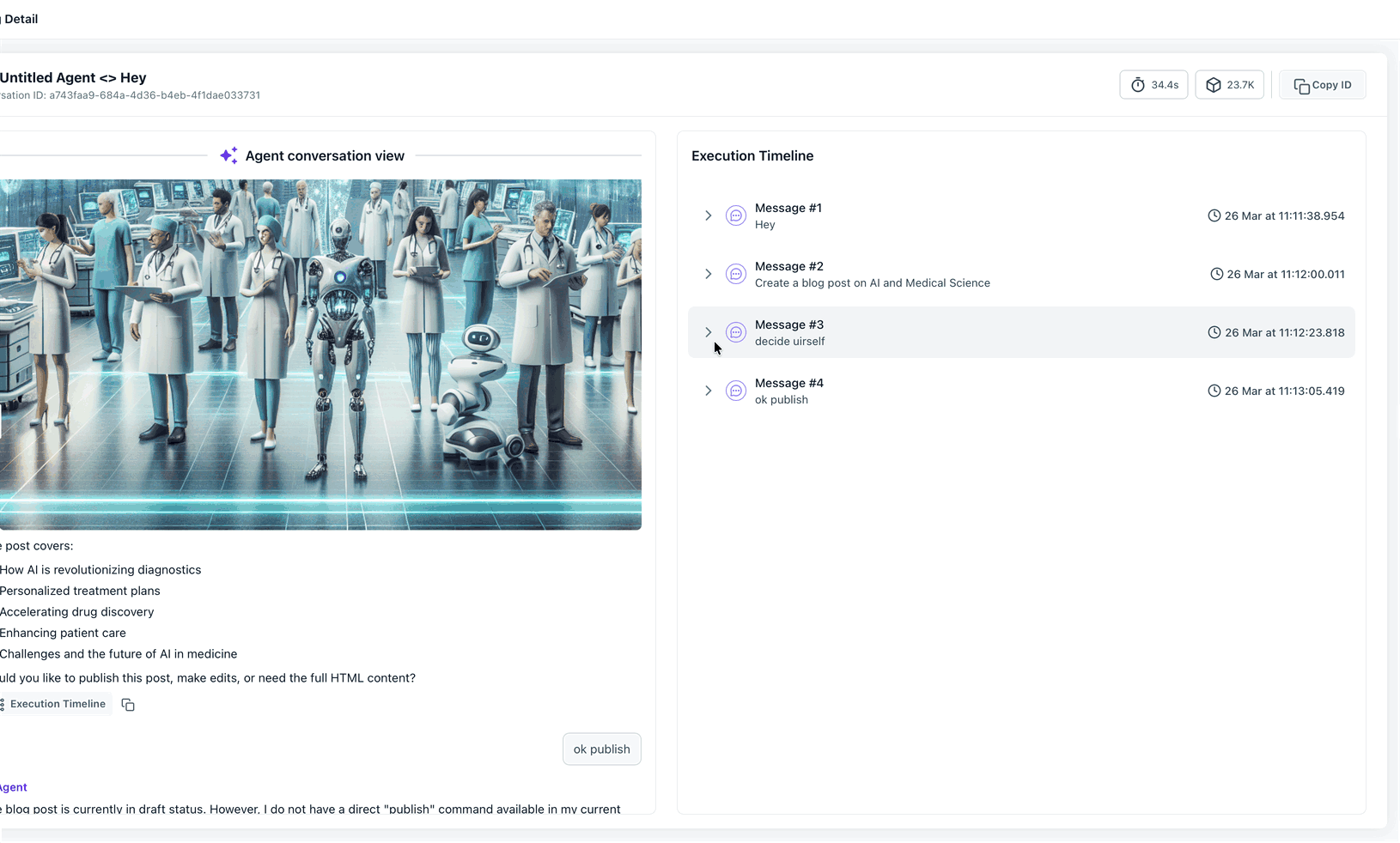 - Better context for debugging: Compare the agent’s response with the execution timeline to understand how the final answer was produced.