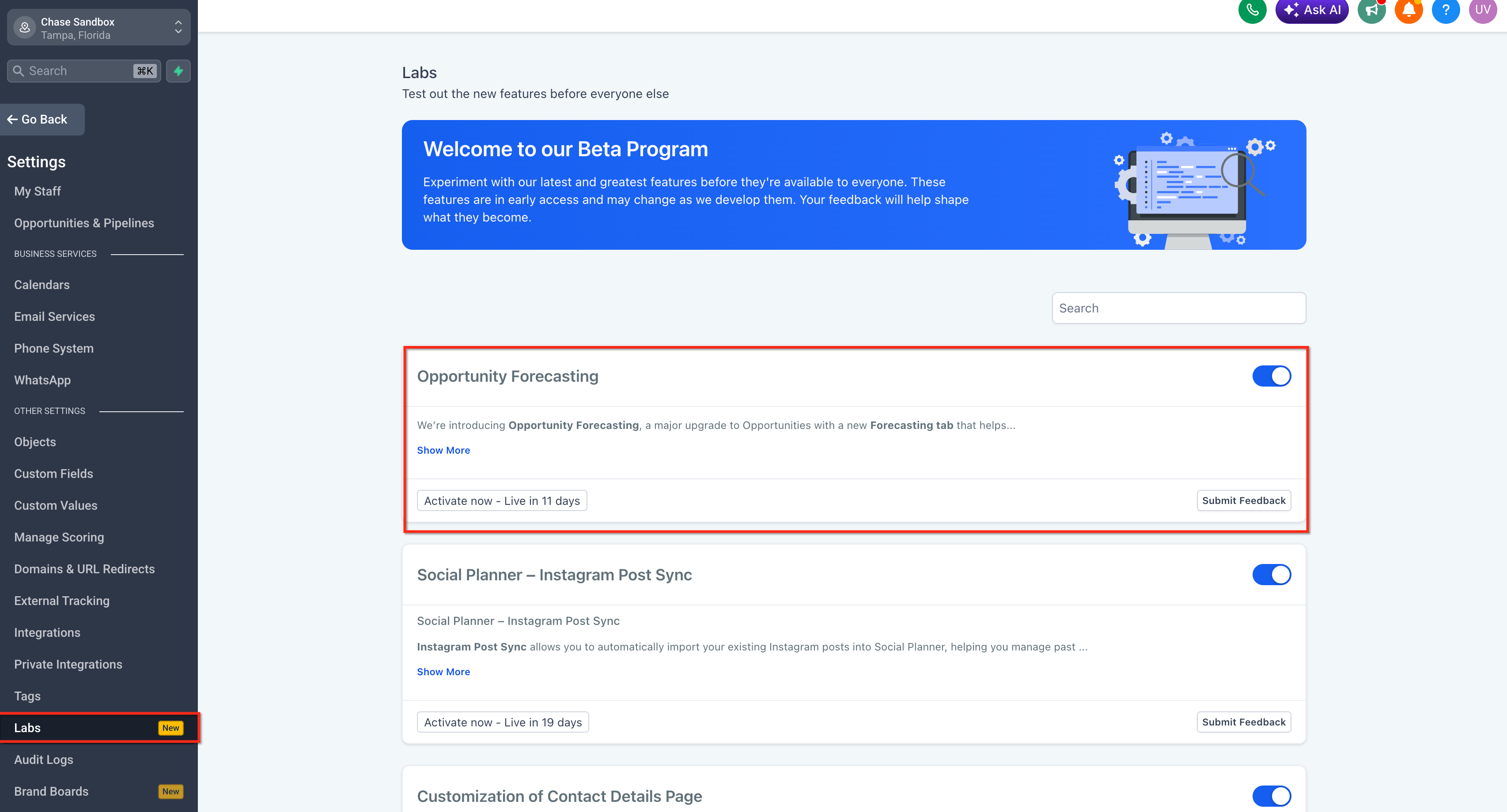 Opportunity Forecasting is a forecasting workspace inside Opportunities that helps teams estimate revenue based on deal value, expected timing, and opportunity probability. It introduces a dedicated Forecast tab where users can review summary metrics, analyze pipeline timing in a visual forecast view, drill into underlying deals, and improve forecast quality by addressing missing or outdated data. The feature is enabled through Labs, which HighLevel uses for early-access and evolving functionality.