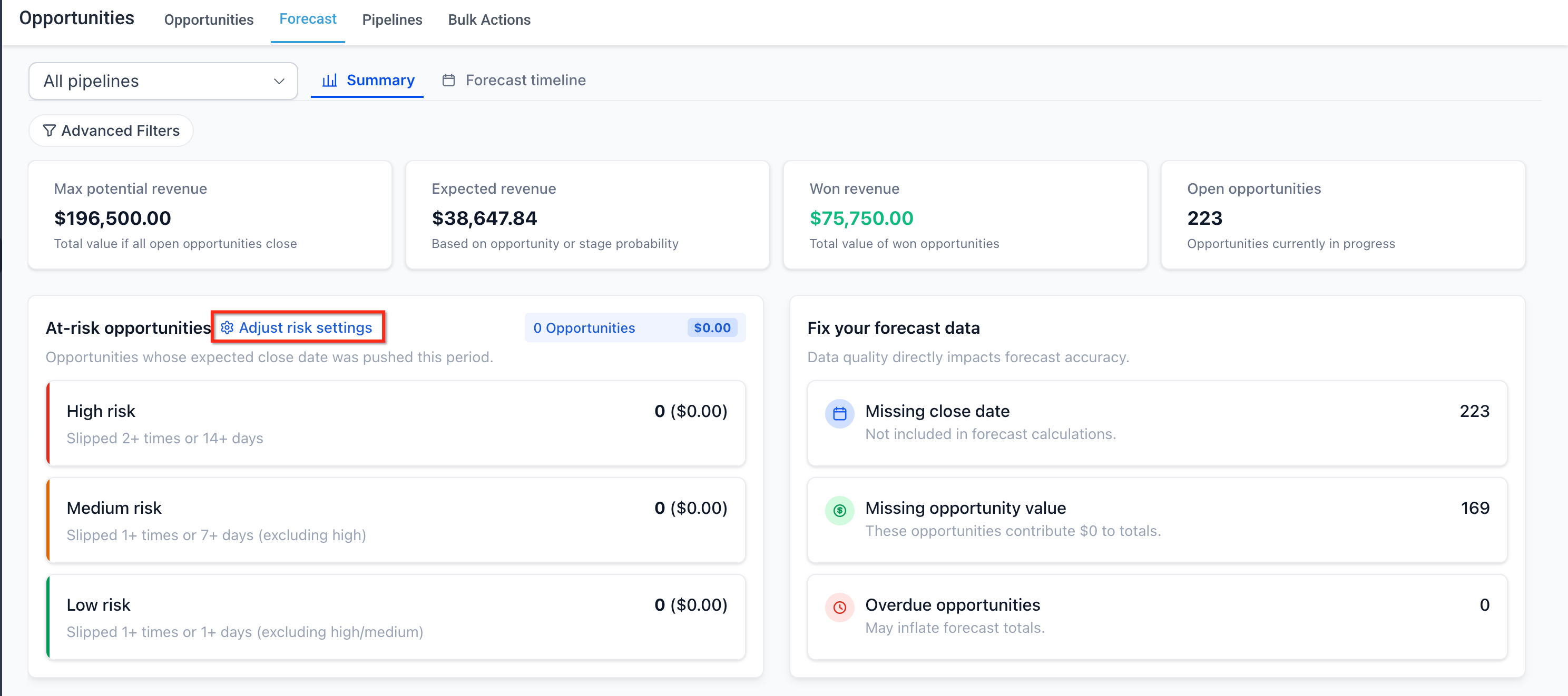 Forecasting is not only about projected revenue. It is also about understanding how likely deals are to slip or miss their expected timing. Risk indicators help teams focus attention on opportunities that may need follow-up before they affect forecast accuracy.