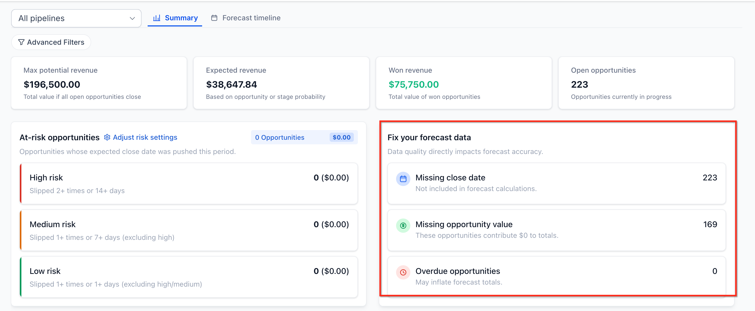 - Cleaner Pipeline Management: Identify missing amount values, missing dates, stale opportunities, and other data issues that can weaken forecast quality.