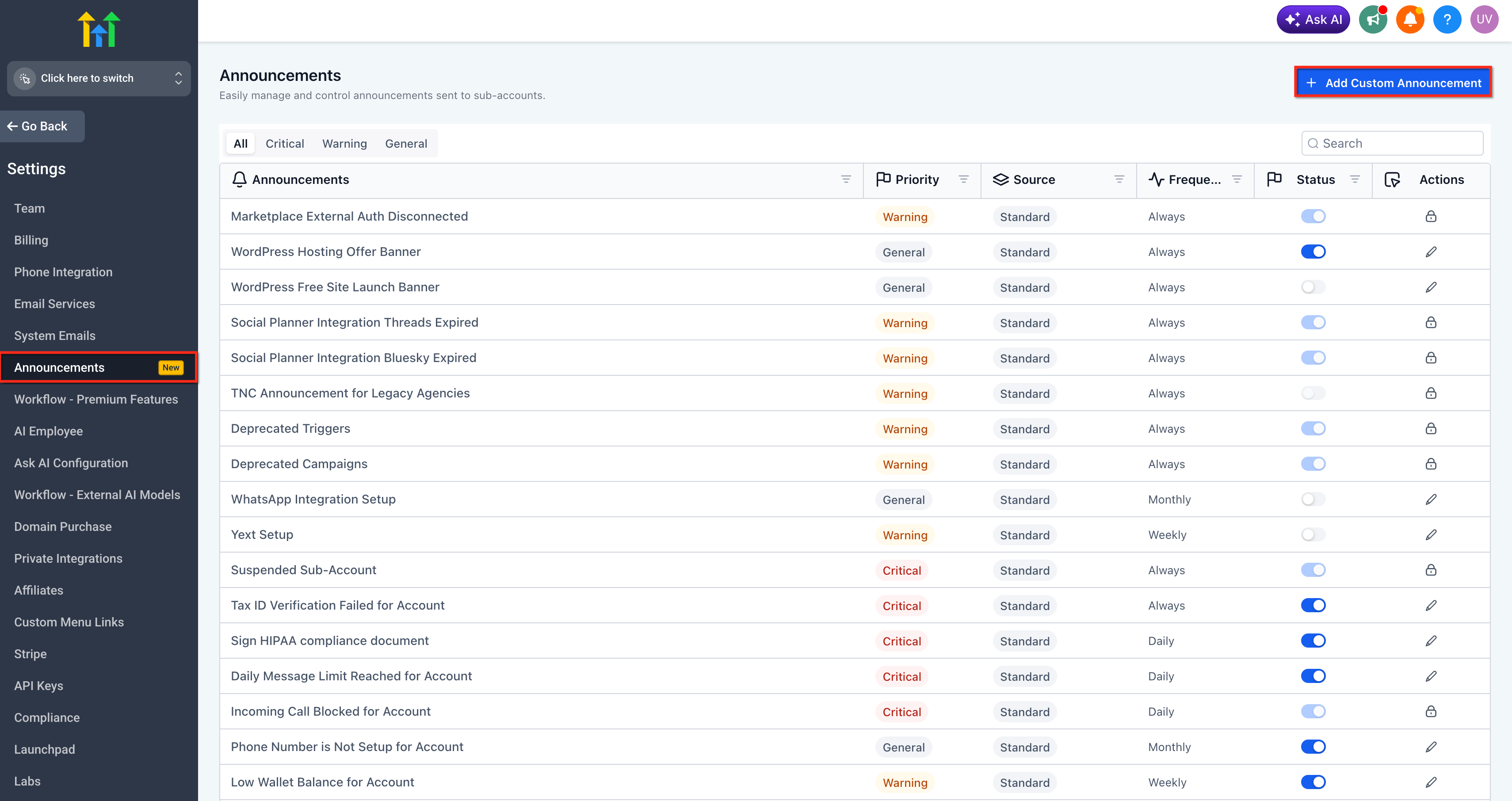 - Navigate to the area in HighLevel where Announcements Builder is available for your agency. Click "Add Custom Announcement" to create a new announcement.