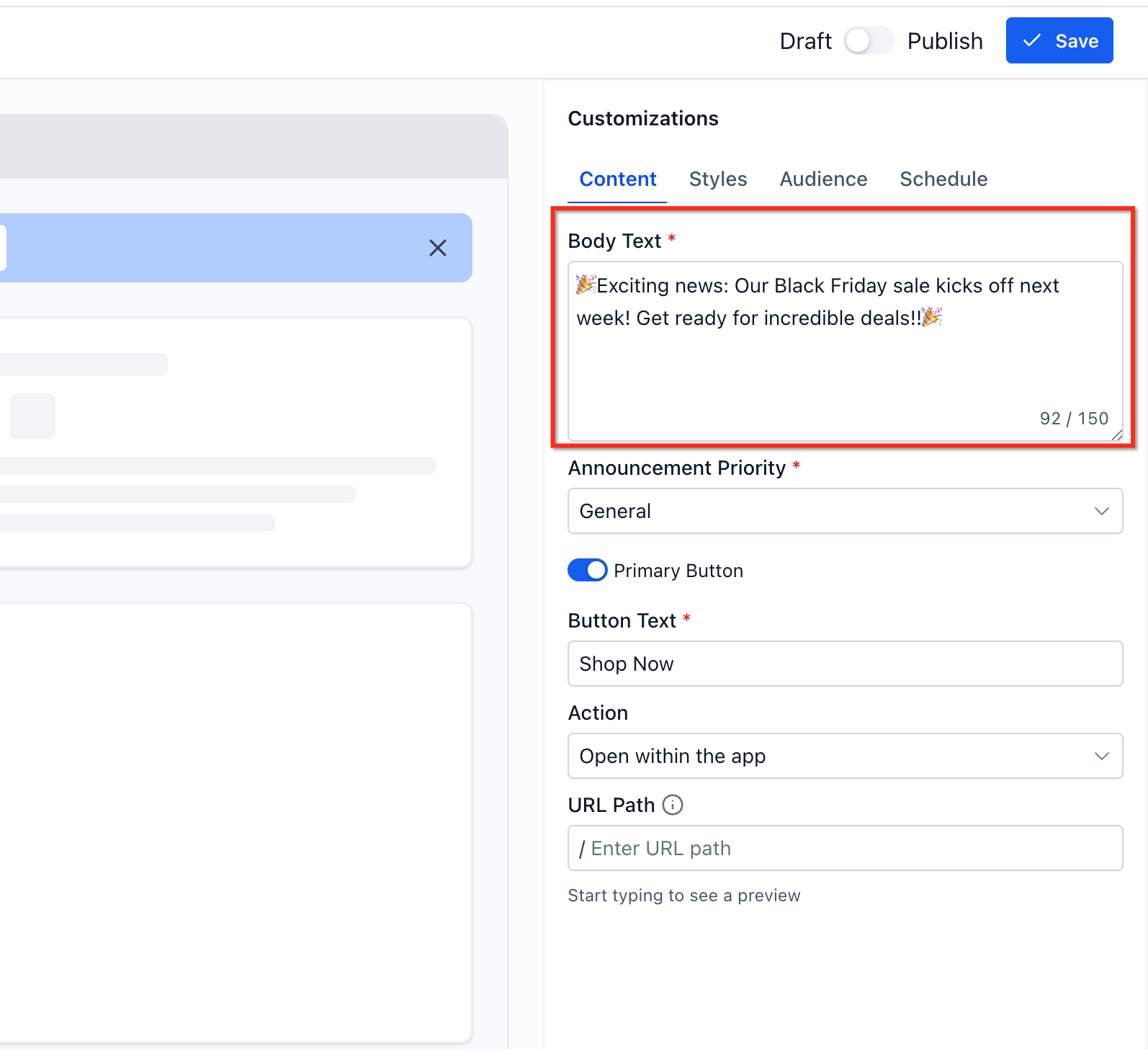 - Add the Message Content for the announcement.