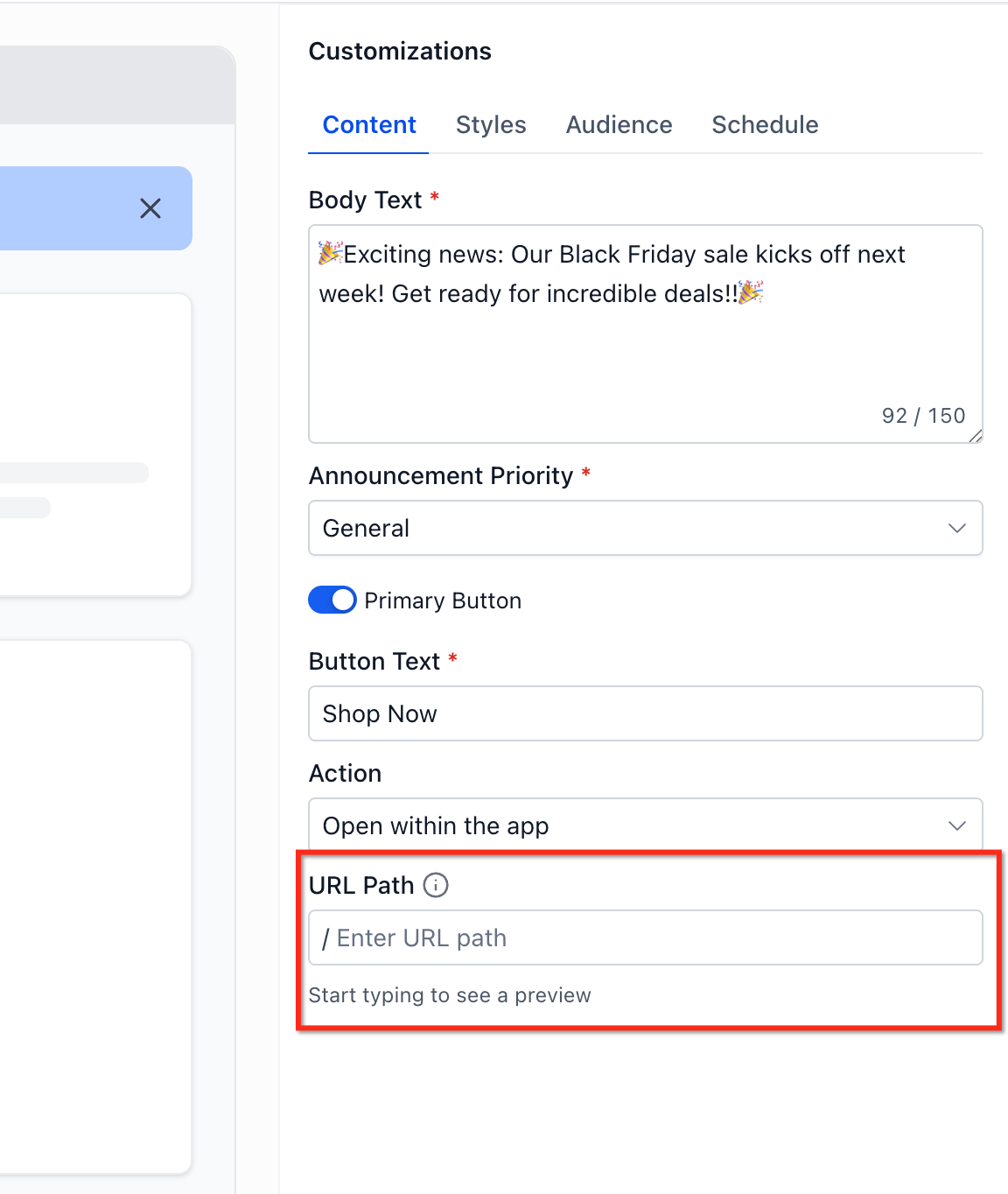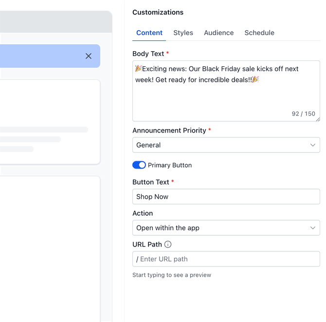 - Action Oriented Messaging: Add an optional CTA button with a destination URL to guide users toward the next step.