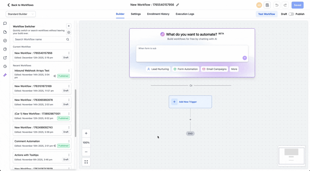 You can search, open, create, duplicate, and delete workflows directly from the switcher panel, helping you stay focused while managing automations.