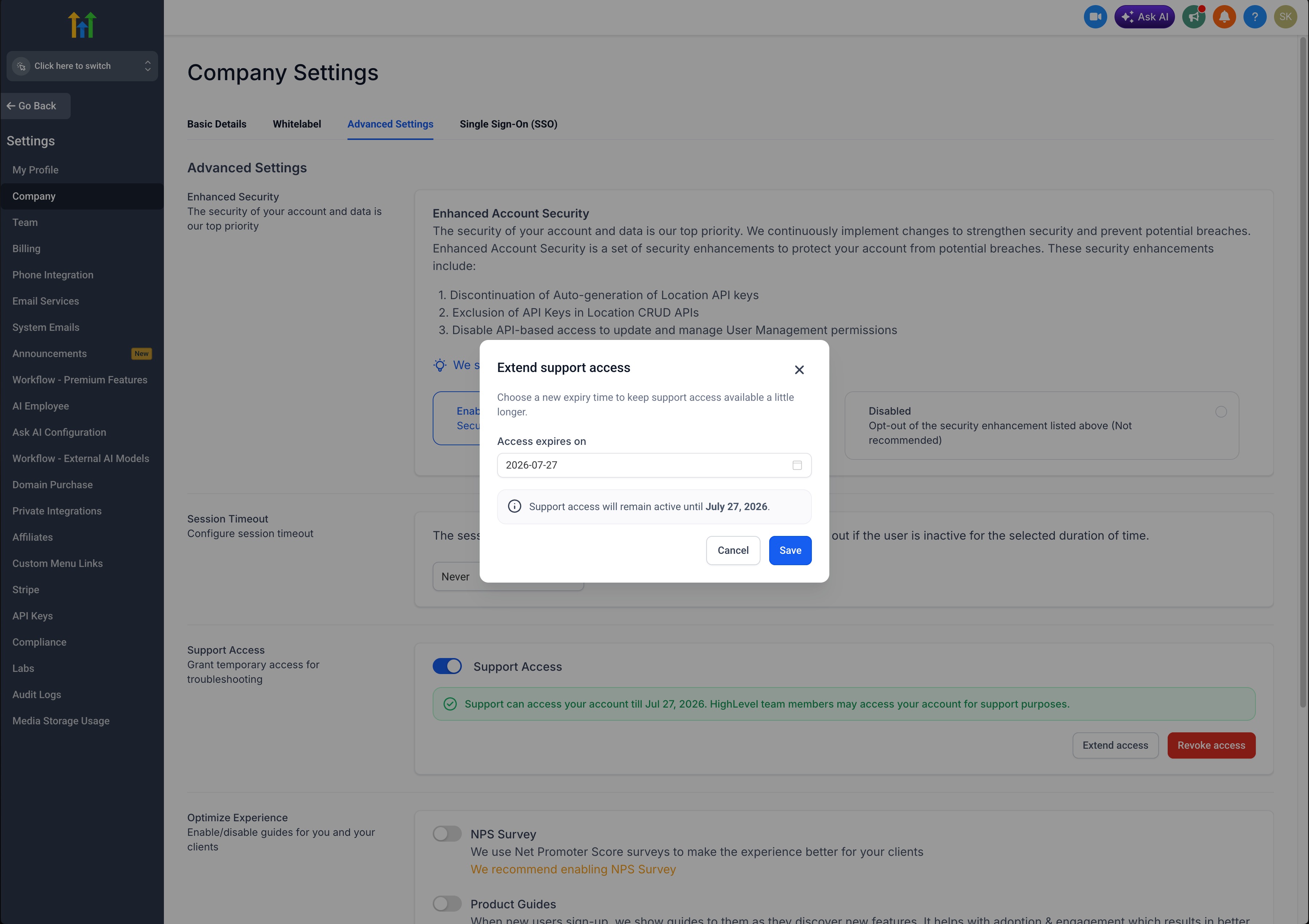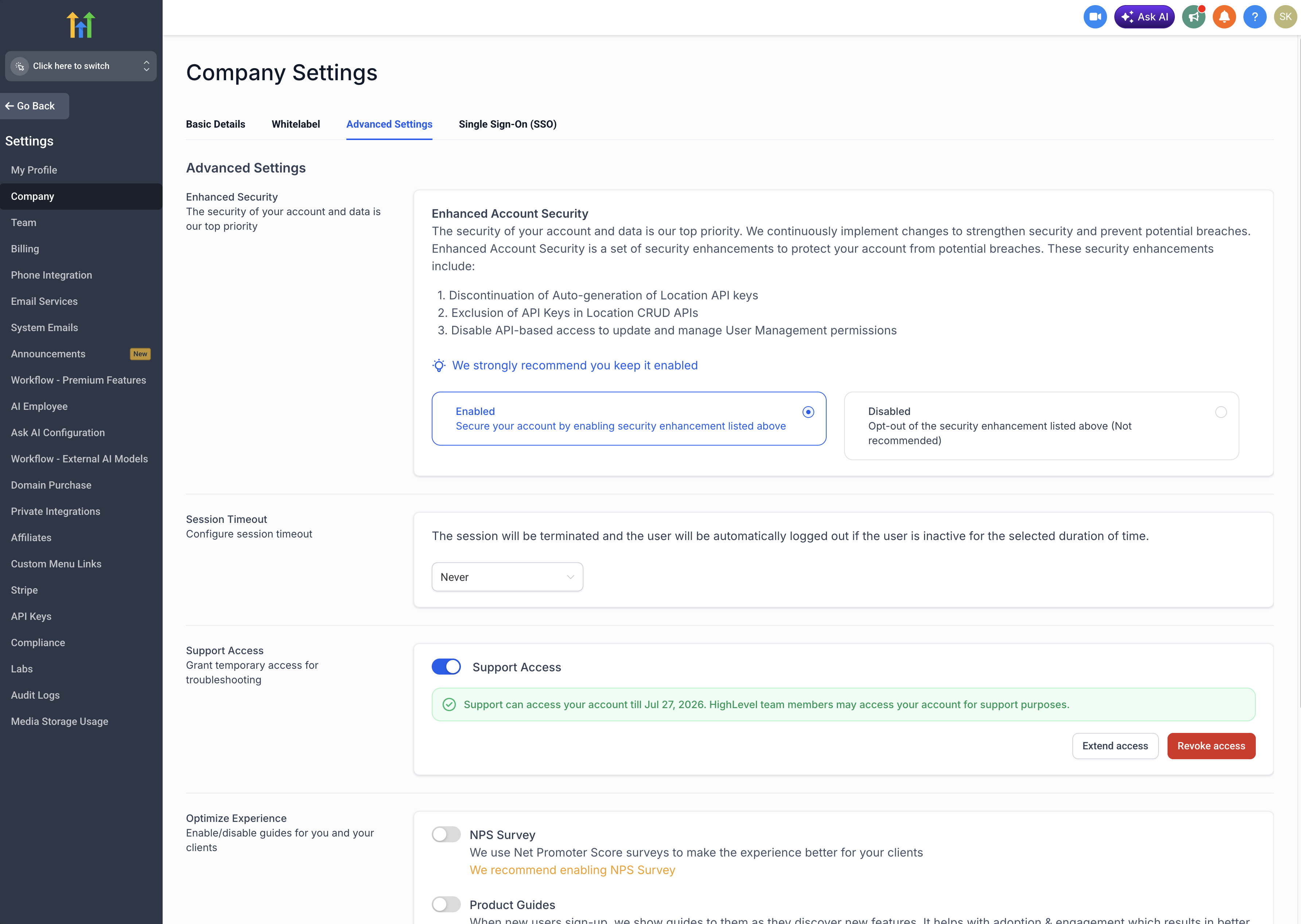 Support Access allows the HighLevel support team to temporarily access your account to help troubleshoot and resolve issues you may be facing. This ensures faster debugging and more effective assistance while keeping you in control of access duration.