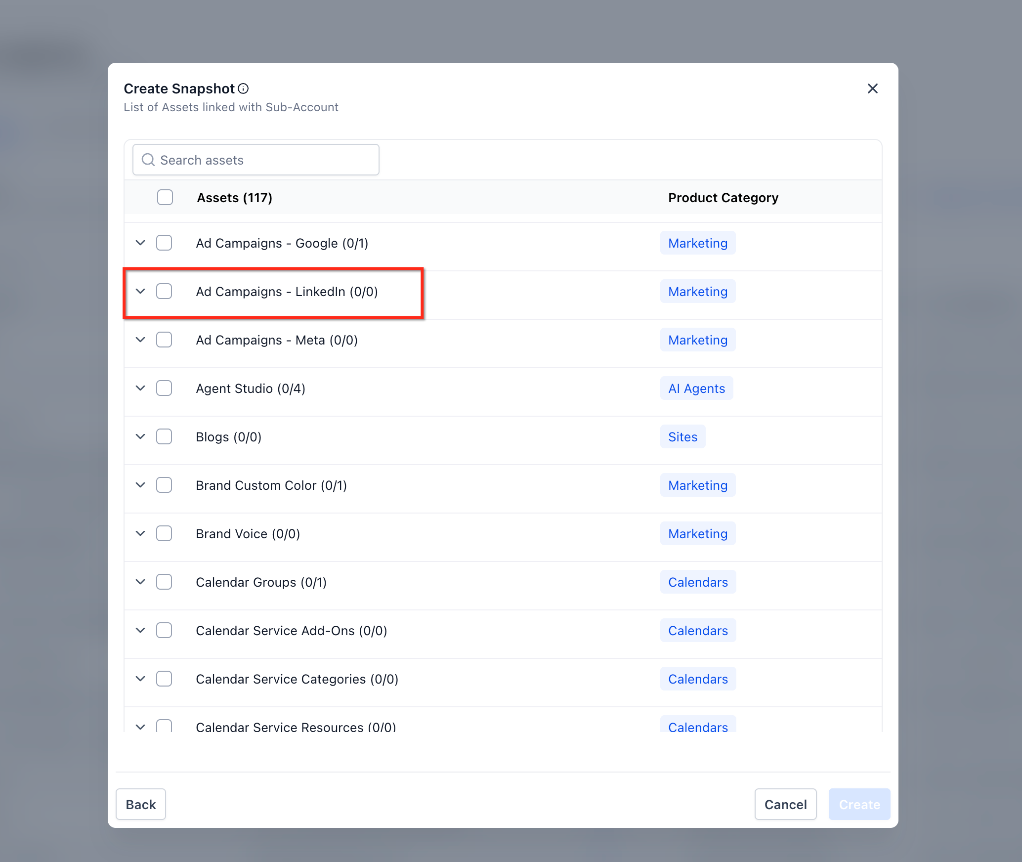 You'll see a list of all assets in the selected sub-account. Click Select All to include everything, or expand each category with + to choose individually. Once ready, click Create.