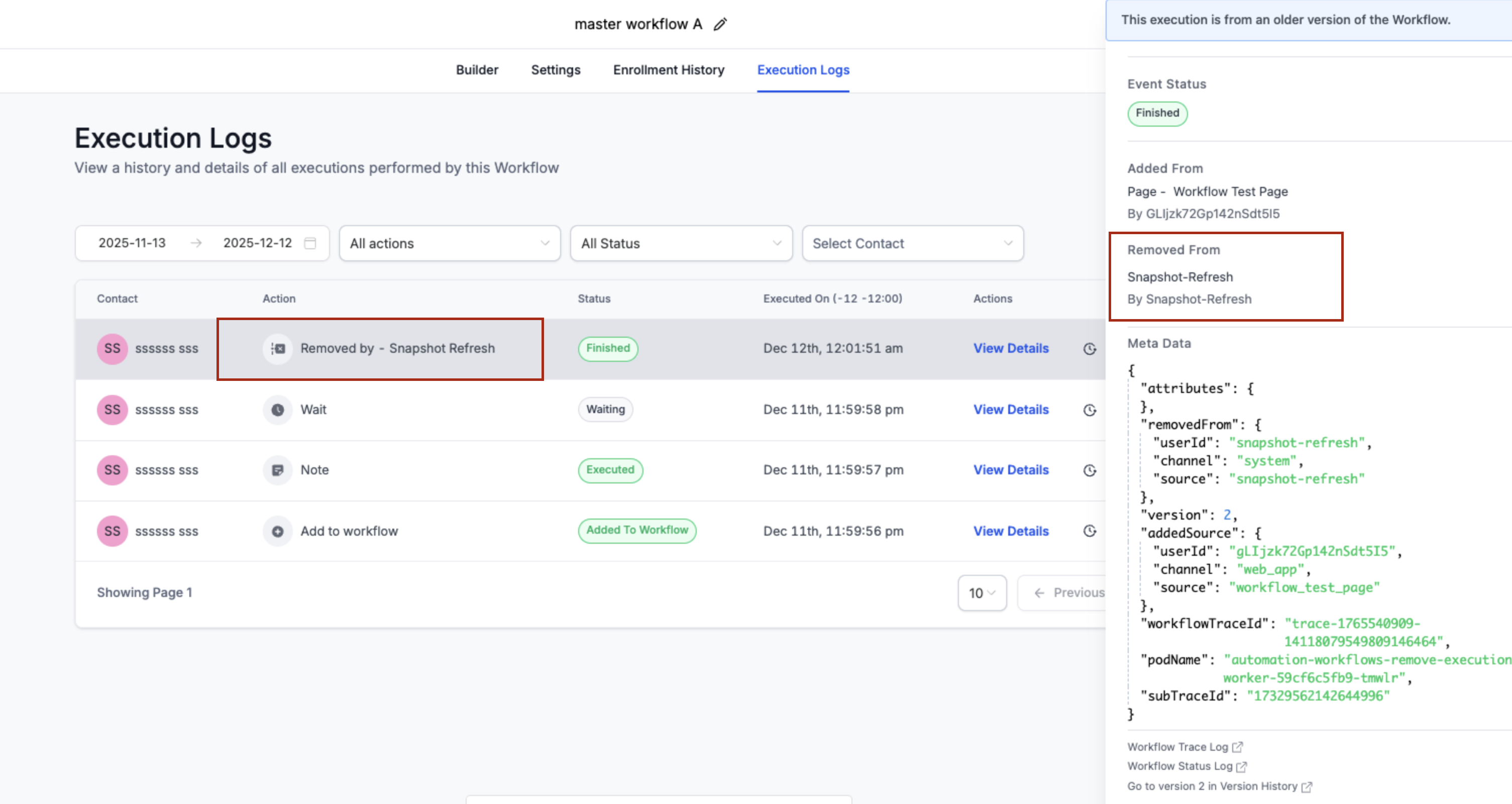 - In Execution Logs, the workflow records an entry labeled “Removed by - Snapshot Refresh” with more details in the side panel.