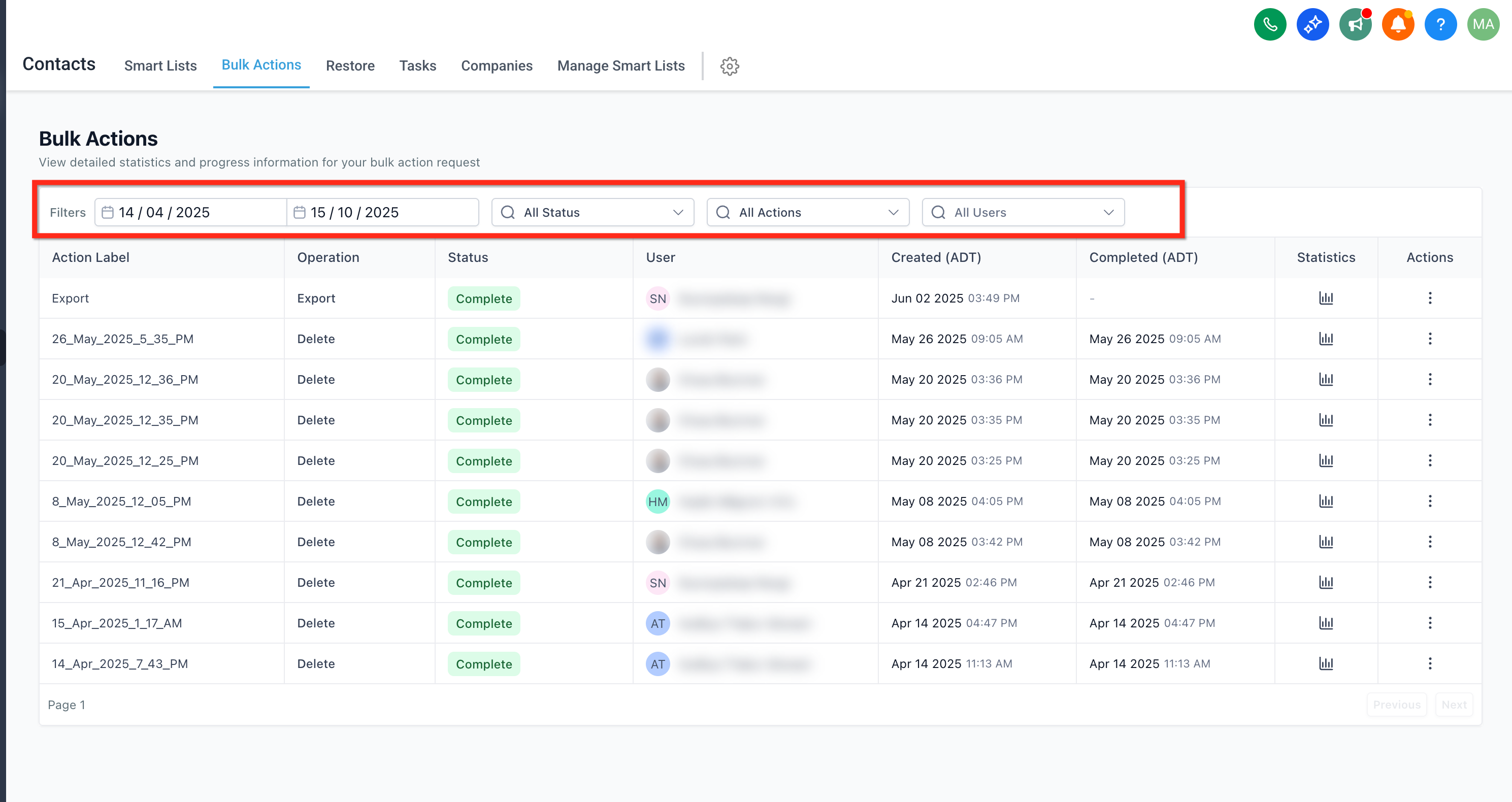 The Bulk Actions page is a central dashboard that lists mass operations initiated from Contacts (e.g., imports, tag updates, bulk messaging, and deletions). It provides live status, outcome metrics, and access to detailed logs so teams can verify results and correct issues quickly.