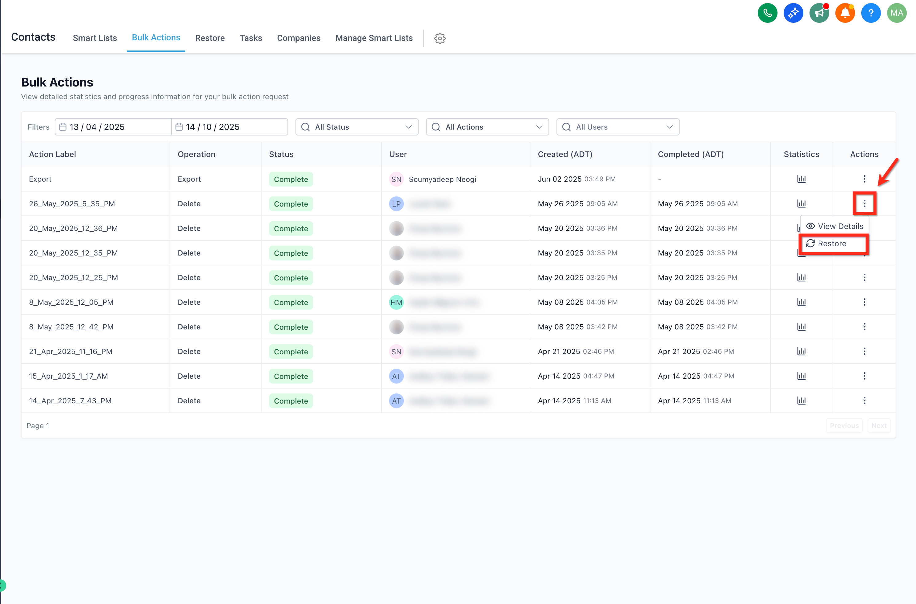 For Delete Contacts jobs within the allowed window, use Restore (when available) to re‑create deleted contacts.