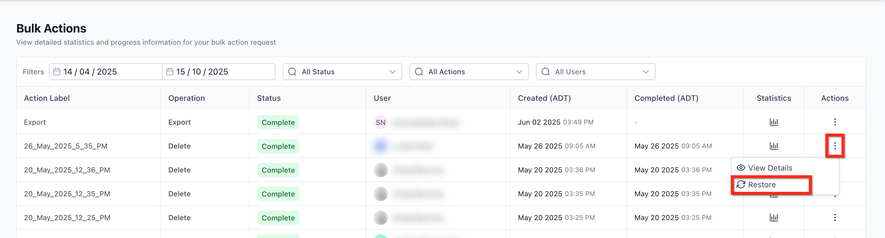 The page displays each bulk job in a table with columns like Action Name, Action Type, Created By, Created At, and Status. From here, you can open Show Stats for detailed results or use the row’s action menu for management options (e.g., pause/cancel for eligible jobs, and restore for supported deletion jobs).
