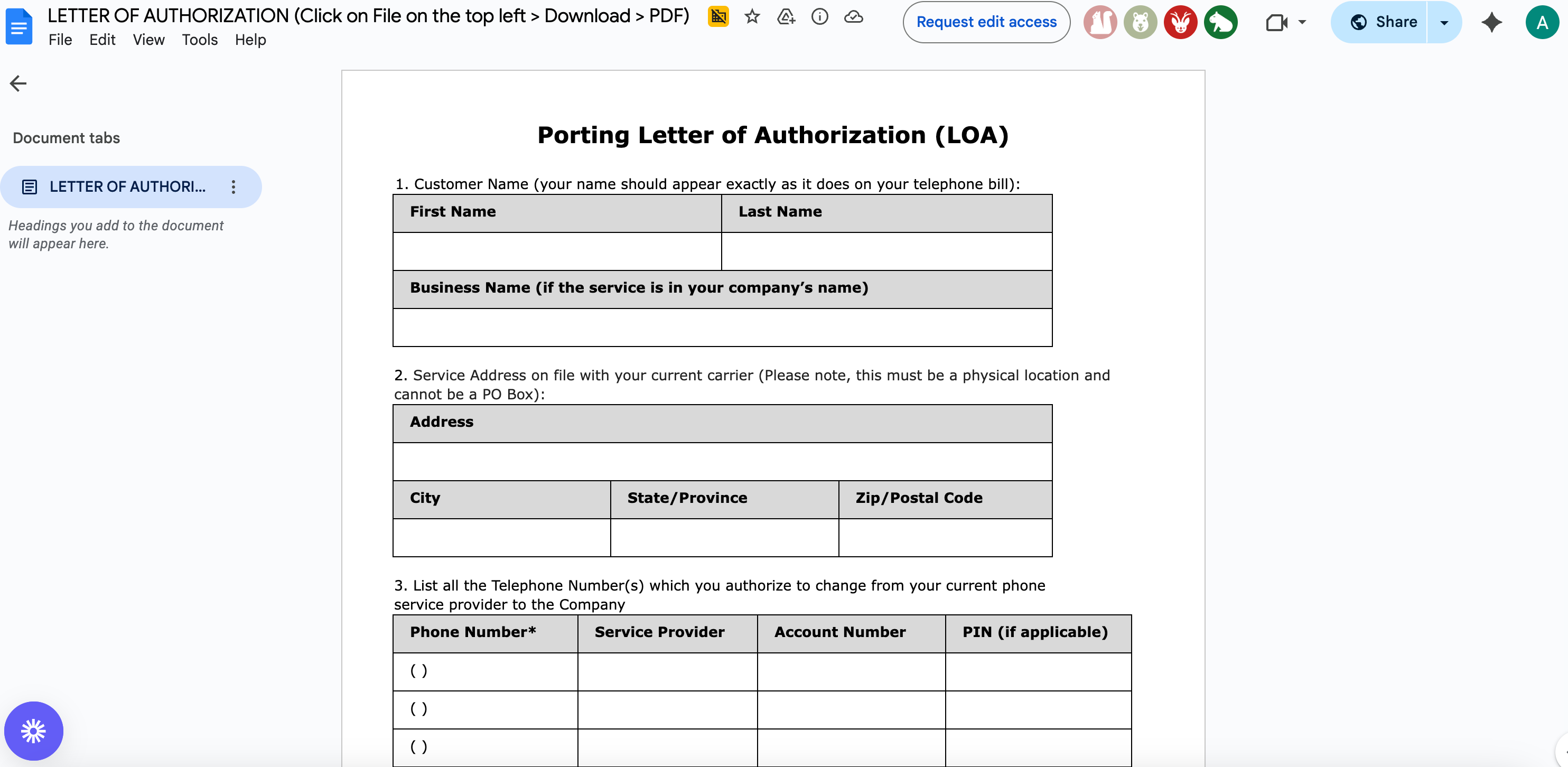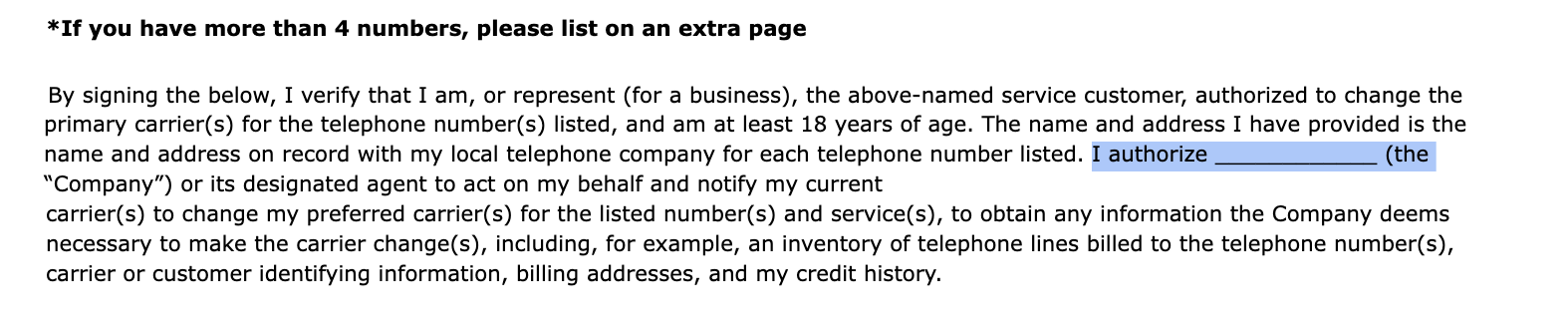 Customer/Business legal name and service address — must match the carrier’s records exactly.