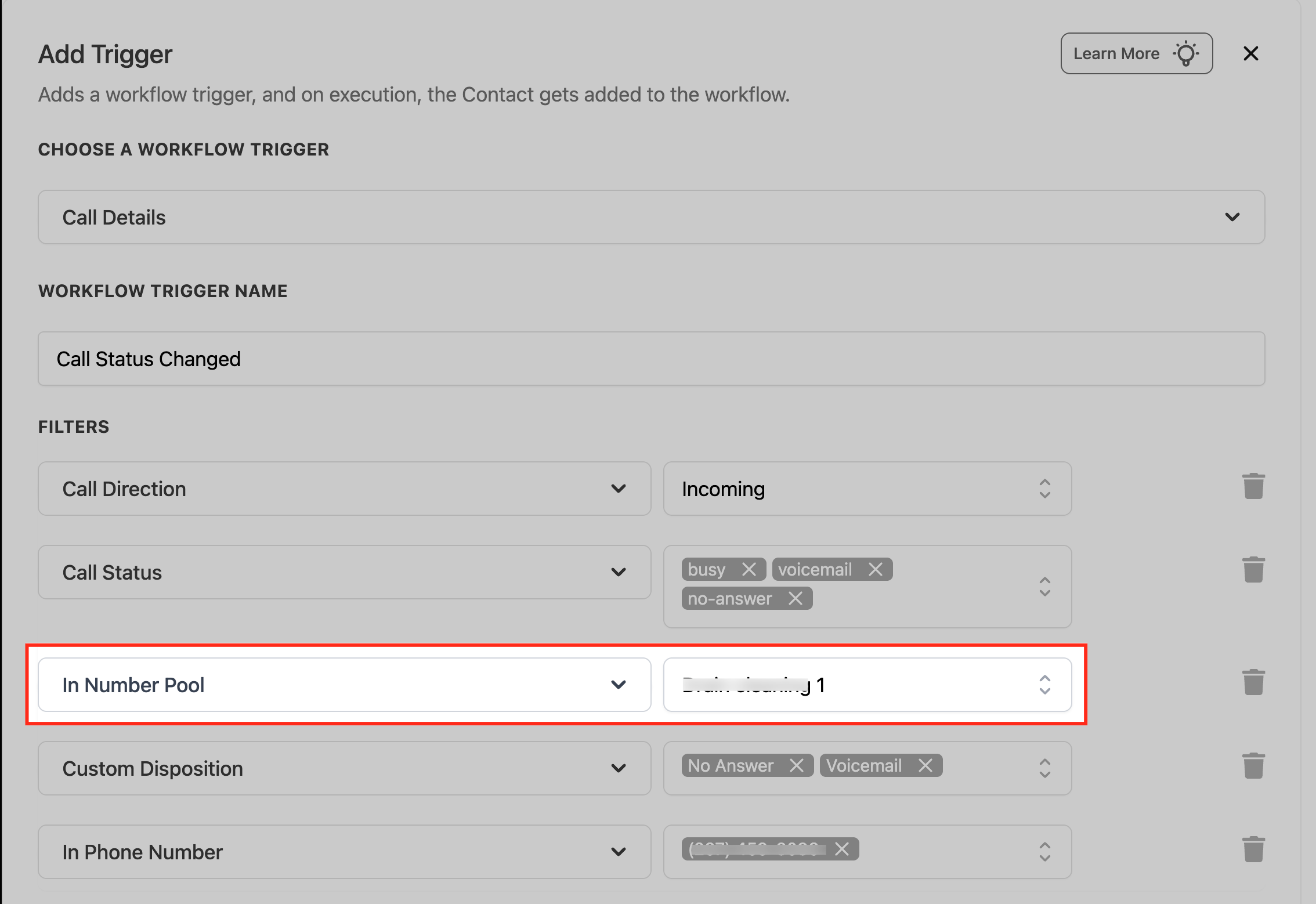 This filter limits the trigger to calls associated with a specific number pool. It is helpful when different number pools are used for different campaigns or teams. Applying this filter ensures workflows respond only to calls from the intended sources.