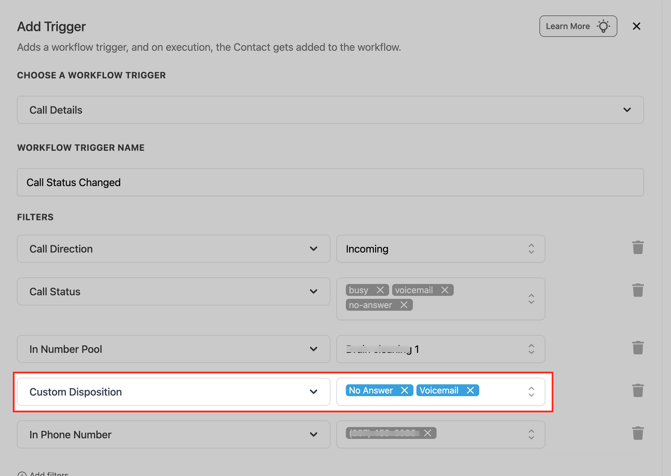 This trigger supports additional filters like call direction, phone number, number pool, and custom dispositions, allowing workflows to respond only to specific call scenarios. It is commonly used to automate follow-ups, apply tags, or trigger internal actions based on how a call concludes or is classified.