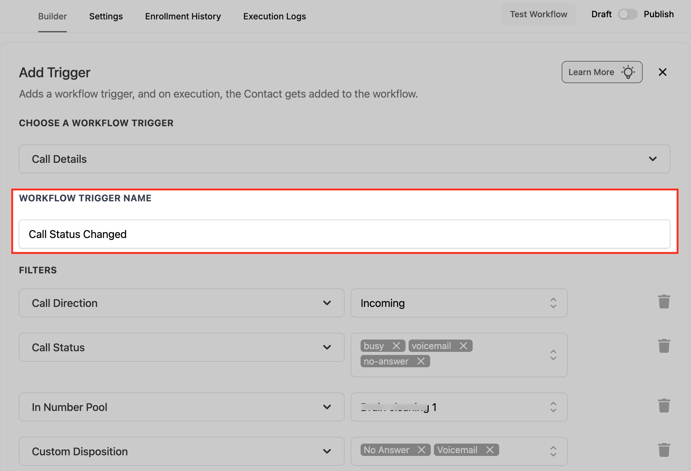 - Provides precise control using call-based filters: Allows workflows to run only for specific call scenarios using filters such as call direction, call status, phone number, number pool, and custom dispositions.