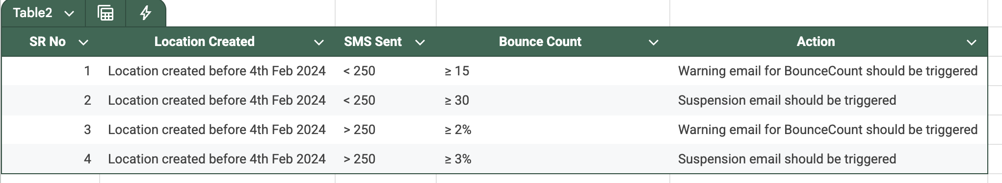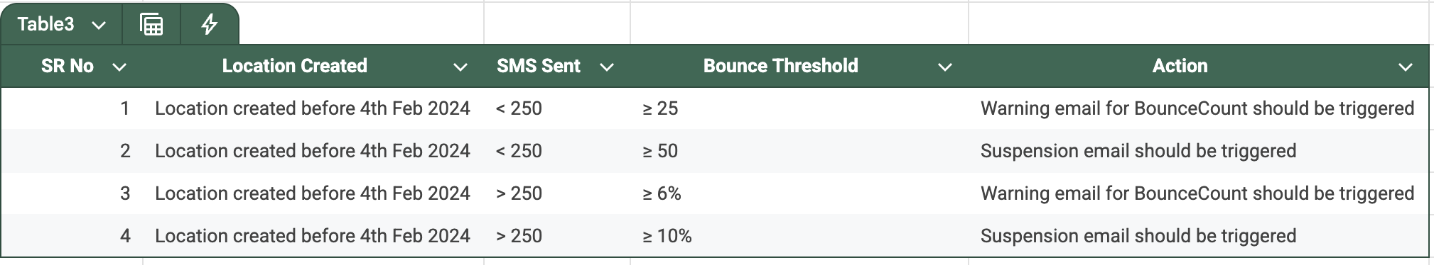This table specifies when warning or suspension emails are triggered based on: