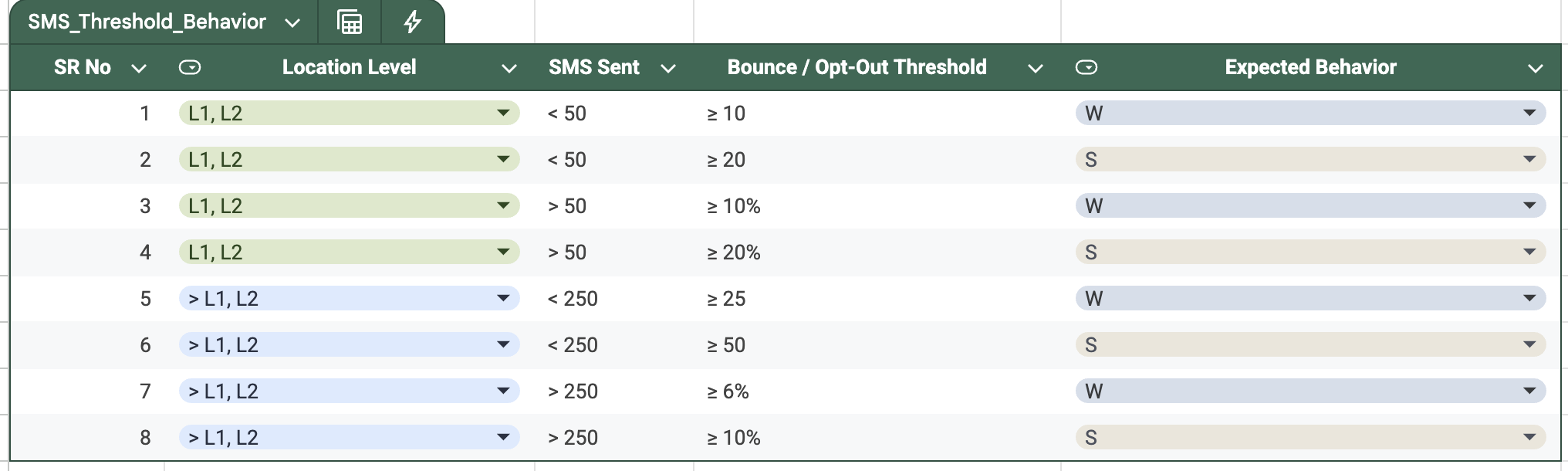 Below is the chart outlining the opt-out and bounce rate thresholds at which Warnings (W) and Suspensions (S) are triggered.