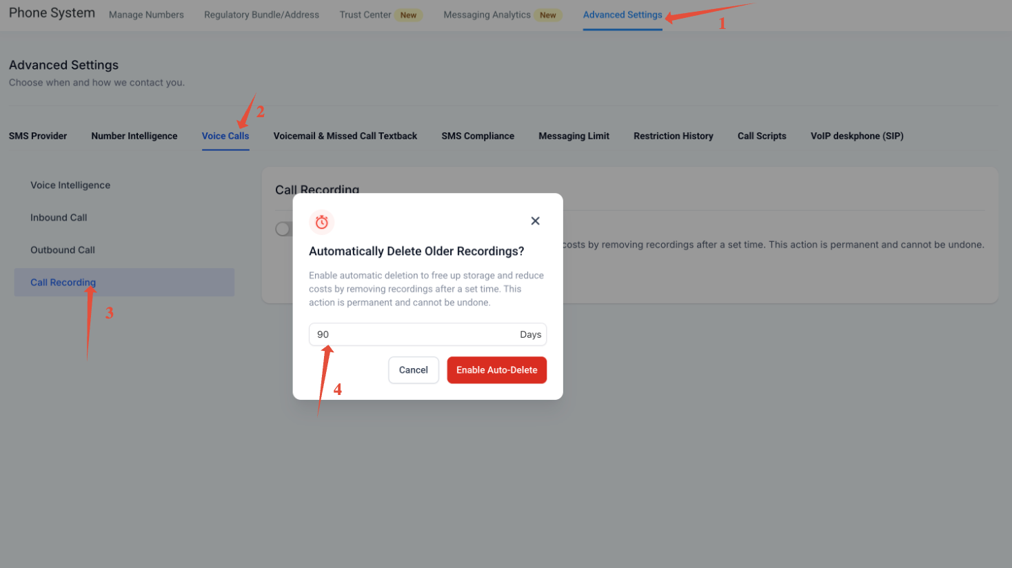• Retain recent call recordings and delete older ones using the feature "Automatically Delete Older Recordings" under Sub-account settings > Phone Numbers > Advanced Settings > Voice Calls > Call Recording