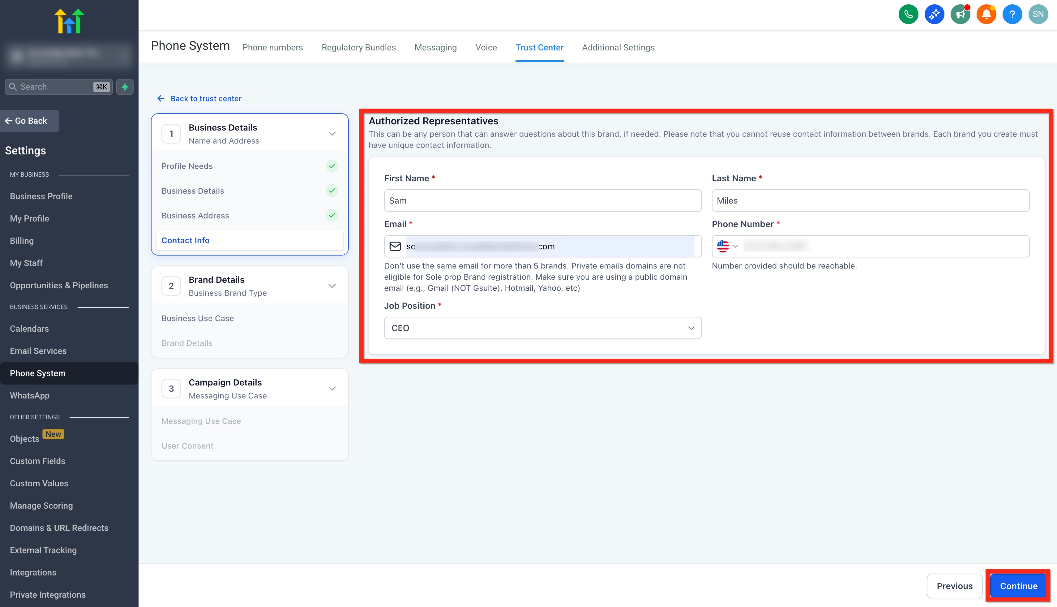 LeadConnector will submit this information to The Campaign Registry (TCR) during the registration. Based on this information, TCR will approve or reject the registrations, so please make sure all the details exactly match those in your US EIN listing (or your country Tax ID form). If there are any differences - for example, in the business name, number or address - your application would be rejected.