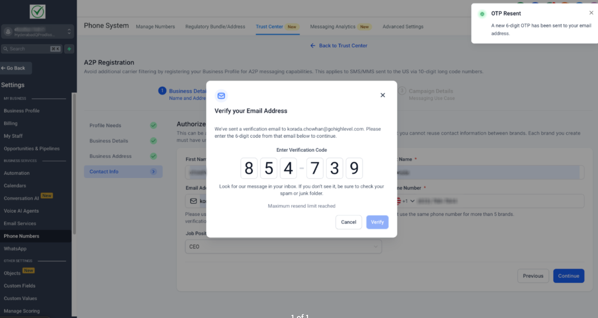 Please reach out to HighLevel support. We’ll share a form that you can submit, and our team will create the brand and campaign manually in the backend for increased throughput.