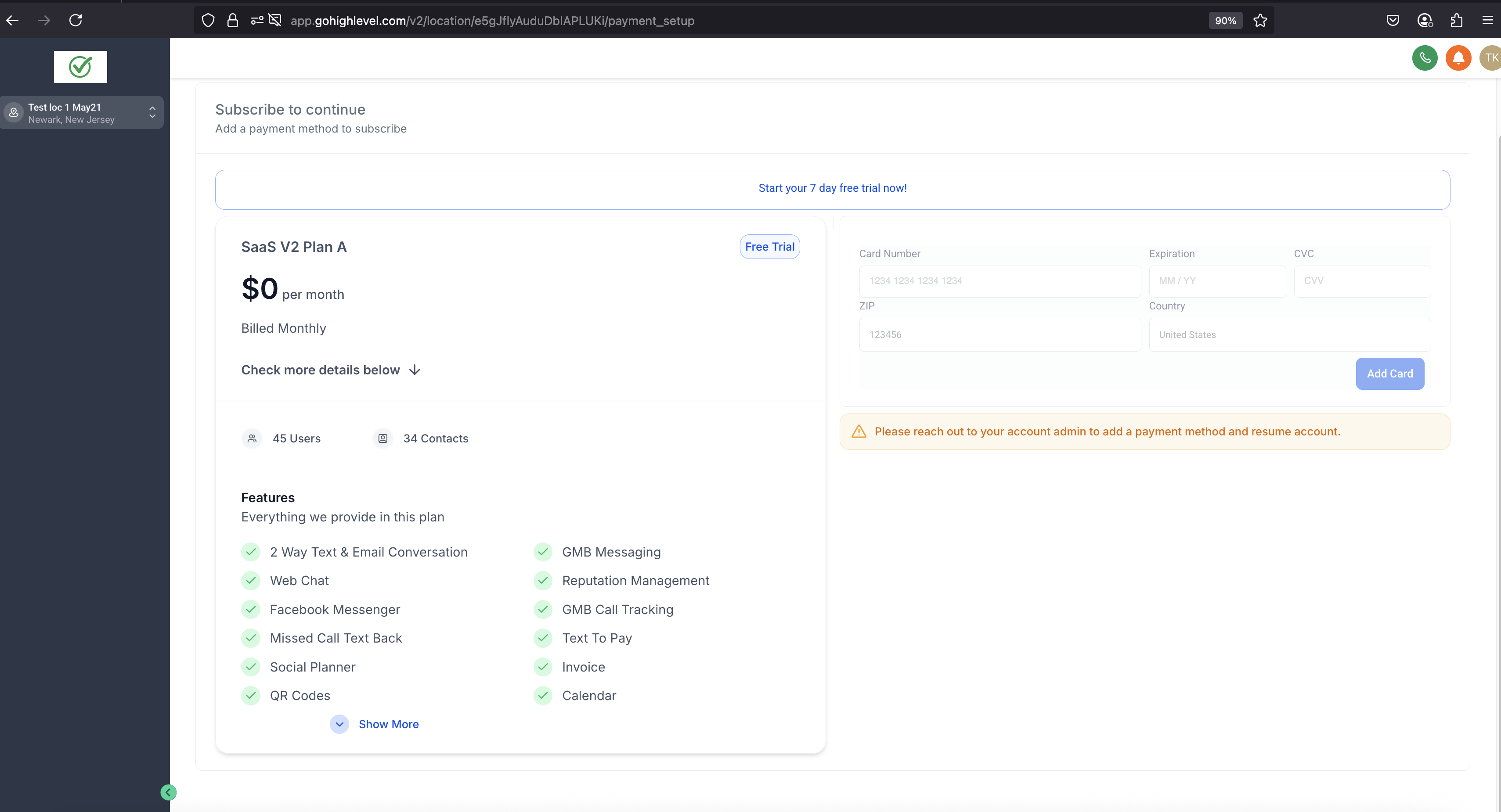 2. Sub-account admins can update the payment method if a payment method is required to continue.