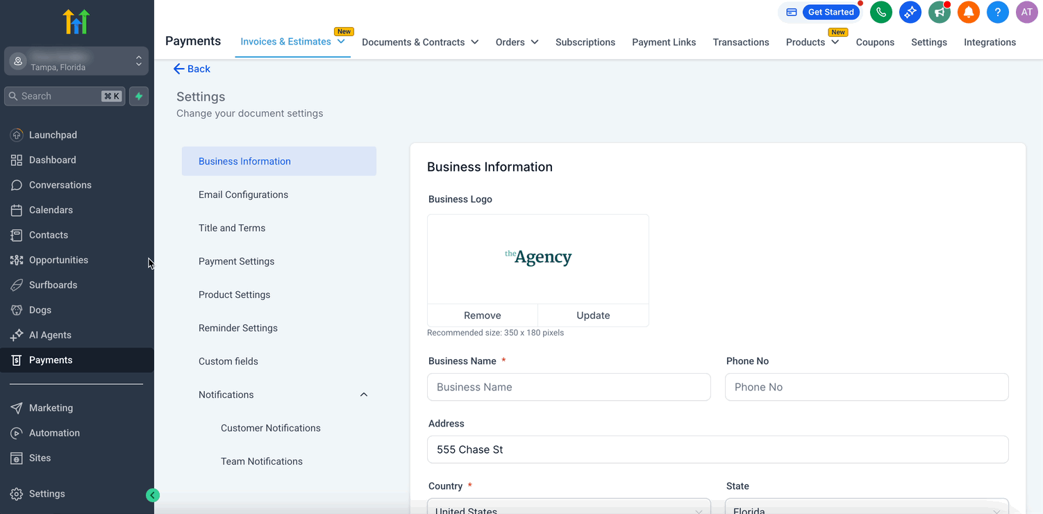 Currently, HighLevel provides a standard invoice template. While you can add custom details like your business name, logo, and notes, more advanced customization options, such as adjusting layouts or colors, are not available at this time.